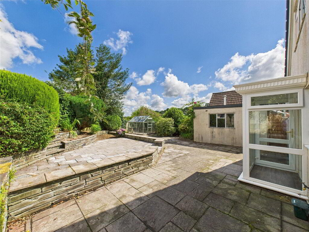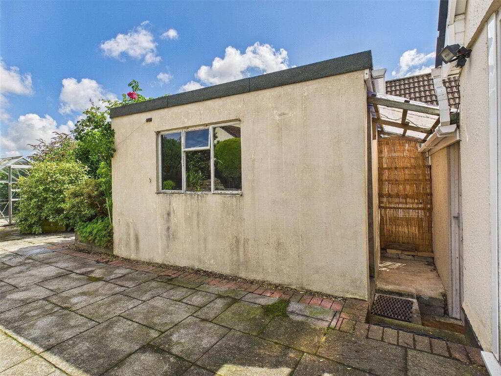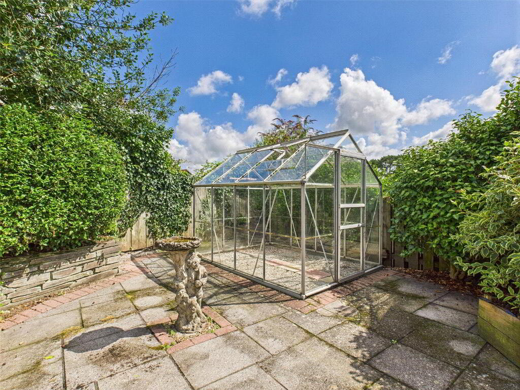 Externally, the property is set on a low-maintenance plot and offers a private driveway with parking for multiple vehicles. The front garden is attractively landscaped with mature shrubs and a paved pathway, while side access leads to a rear garden featuring a greenhouse, a block-built shed, and access to a generously sized garage.