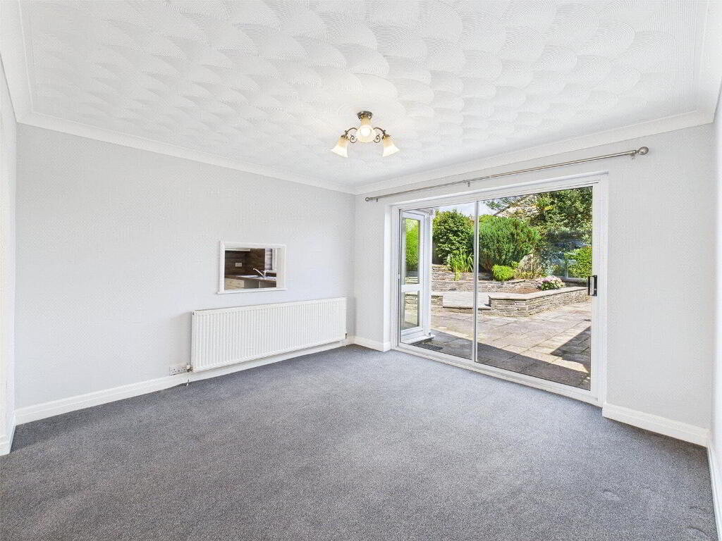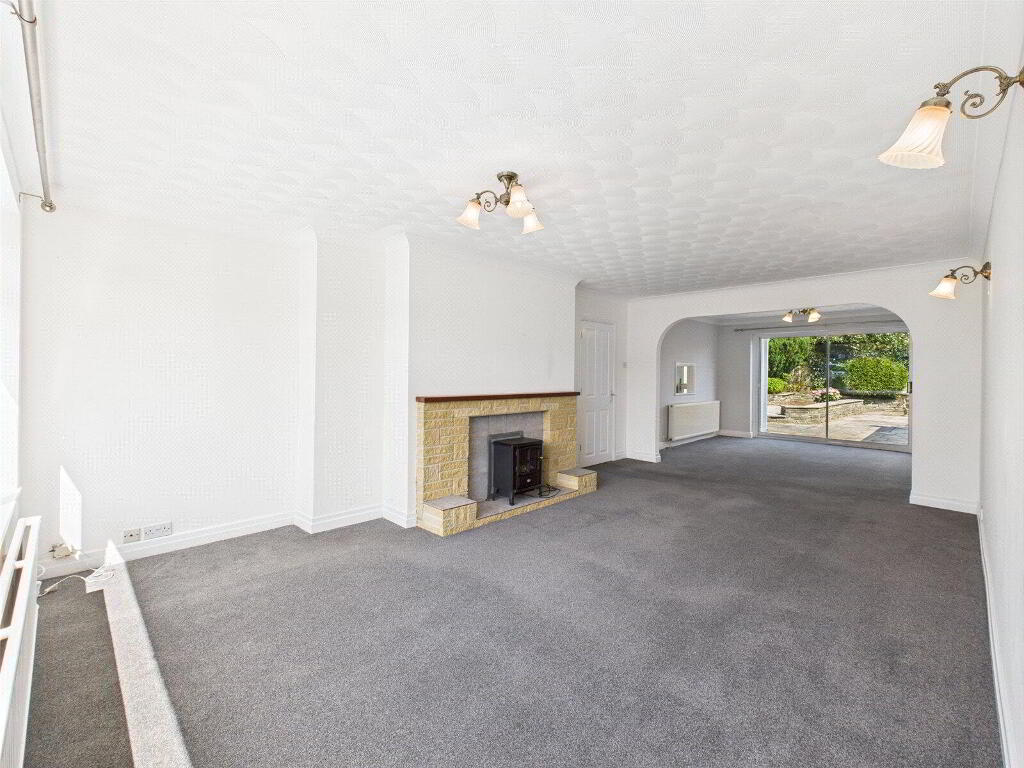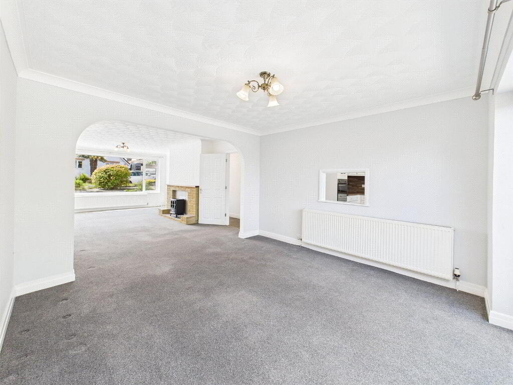The heart of the home lies in the generous open-plan living and dining area. The living space features a charming fireplace and flows seamlessly into the formal dining area through a wide archway — a fantastic space for family gatherings and entertaining. Sliding doors from the dining area lead directly to the rear garden, encouraging effortless indoor-outdoor living.