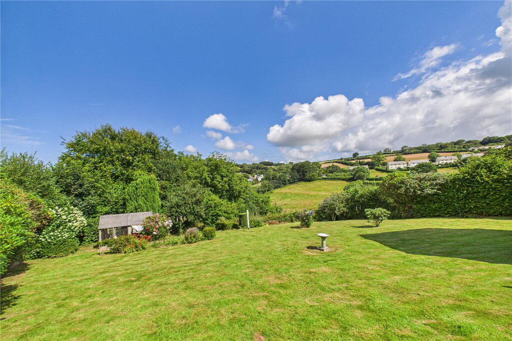 Externally, the front garden includes a level lawn, a tool shed, and mature shrub borders. To the rear, a gently sloping lawned garden leads down via stone steps to a peaceful orchard and a stream, offering a delightful natural sanctuary and additional space for gardening or recreation.