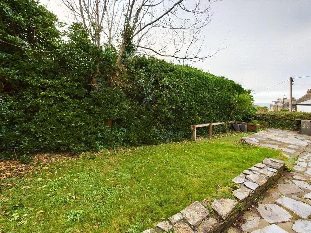 The property is accessed by a private path down to the garden which opens out into views across the village out to sea. The garden offers a patio area and lawn which gets the evening sun during the summer months. On entering the property there is a hallway with original coat cupboards and an archway framing the view into the garden. The property has stripped floors throughout and is very light inside. The sitting room is spacious and has sea views and an open fire. There are two large double bedrooms downstairs, one with sea views. The bathroom is refurbished and tastefully designed with a large bath and overhead shower. There is a dining room with large storage cupboards and a linked kitchen with a cooker and space for a dishwasher and fridge-freezer. Both of these rooms have sea views. To the rear of the property, a utility area offers space for a washer dryer and a garden shed is provided.