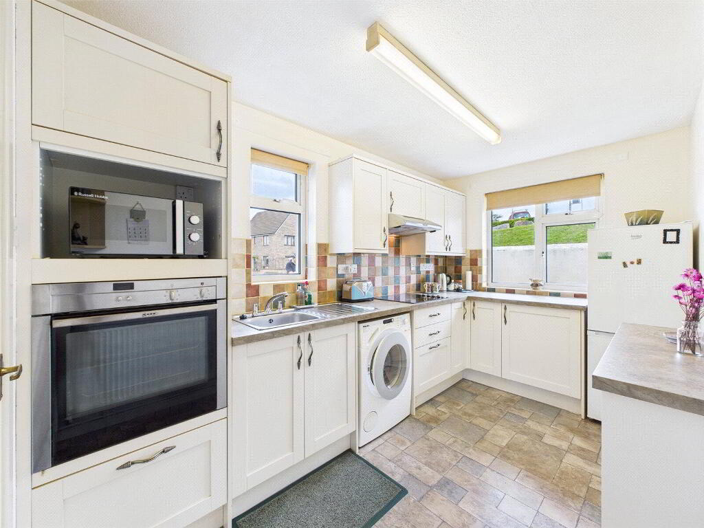 The kitchen is both stylish and practical, featuring dual-aspect windows that allow plenty of natural light, along with integral appliances, generous worktop space, and ample cupboards and drawers for storage. A convenient serving hatch connects the kitchen to the living room, enhancing the flow of the space and making it perfect for everyday living or entertaining.