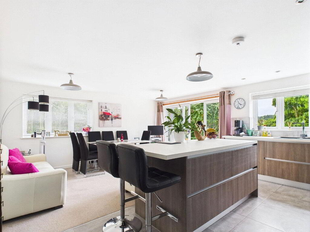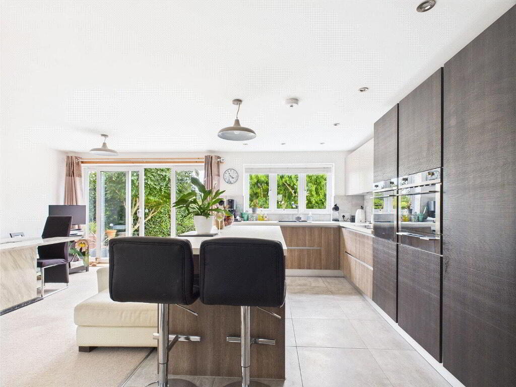 Inside, the property is sleek and contemporary throughout, with well-designed accommodation that flows beautifully. The heart of the home is the impressive open-plan kitchen and living area, where glazed doors open directly onto the garden, creating an ideal space for entertaining or simply enjoying everyday family life.