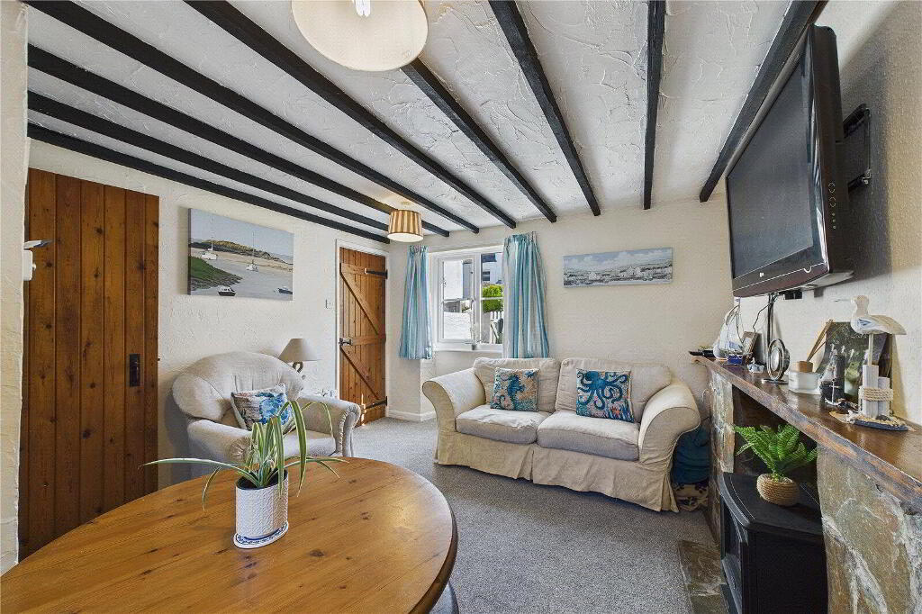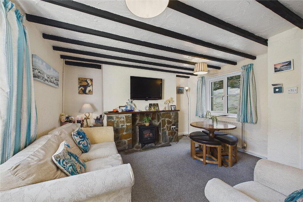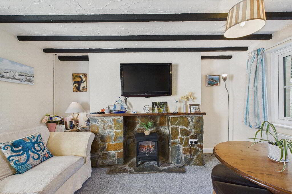 The ground floor is arranged in a bright open plan layout designed to maximise both light and space. The welcoming living area features character beams and a focal fireplace, while large windows flood the room with natural light, creating a comfortable setting for relaxing or entertaining.
