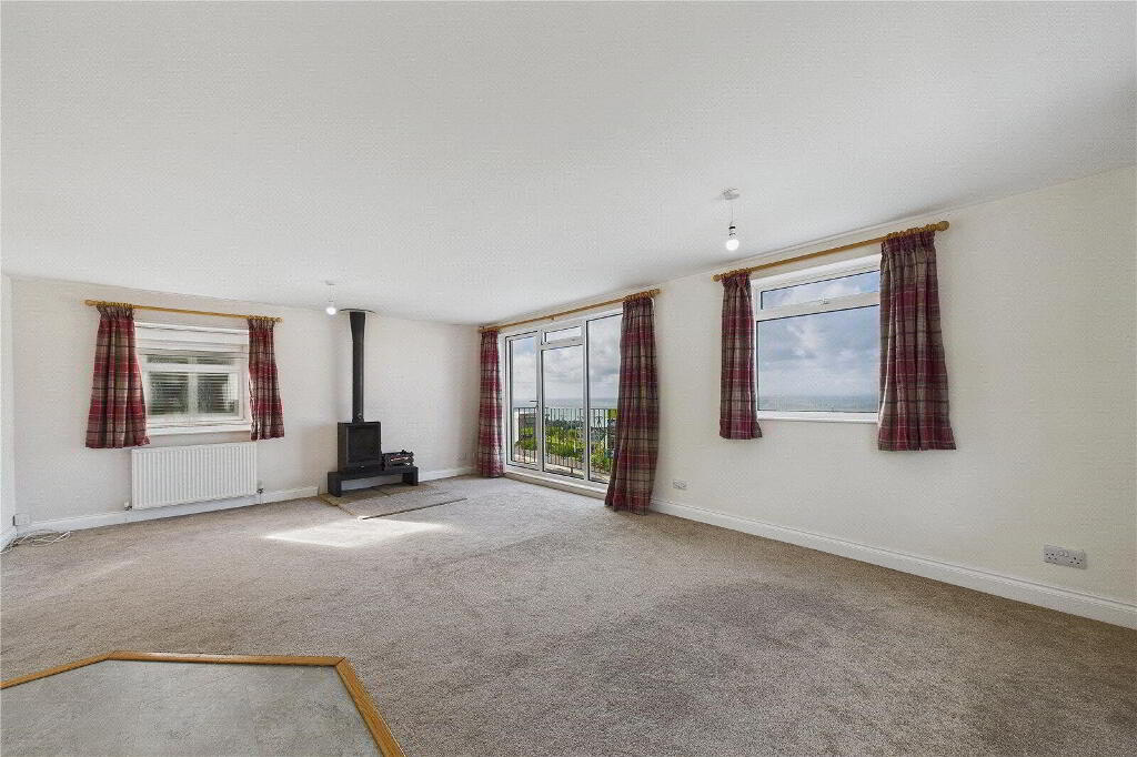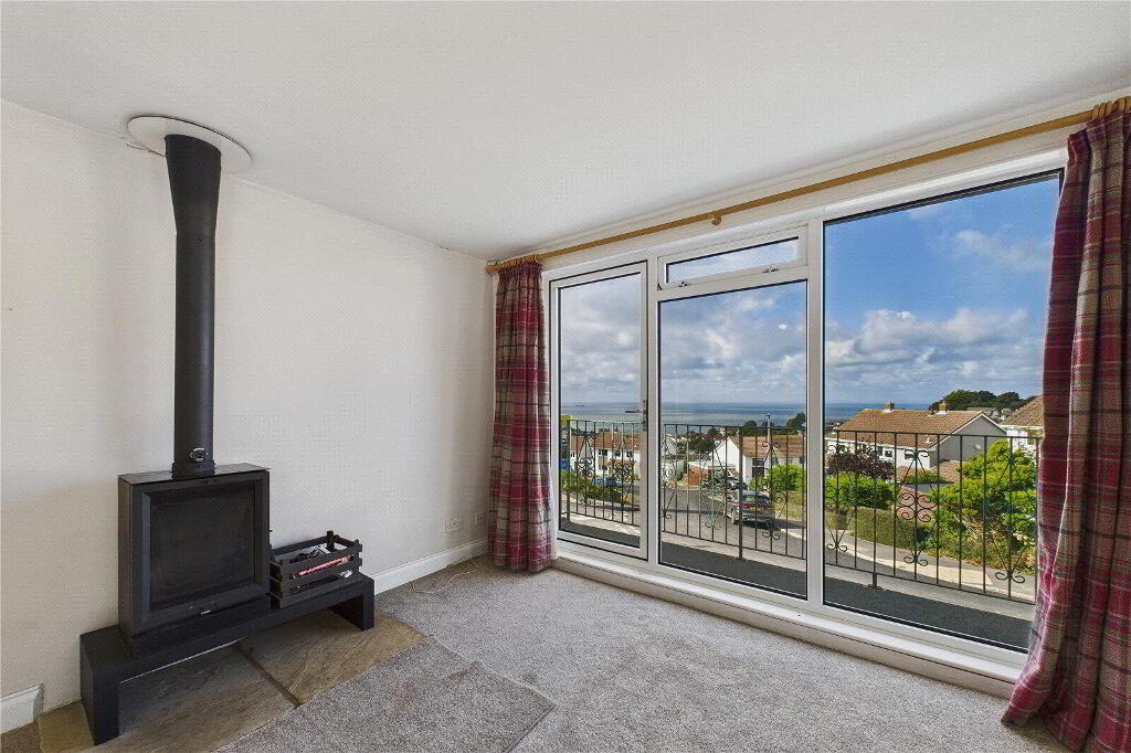 Inside, the home feels bright and welcoming from the moment you step into the split level hallway. A useful store cupboard provides space for laundry appliances, keeping them discreetly tucked away. The lounge is a delightful and airy room with a large picture window and glazed door that opens directly onto the balcony, where the superb coastal views can be enjoyed throughout the seasons.