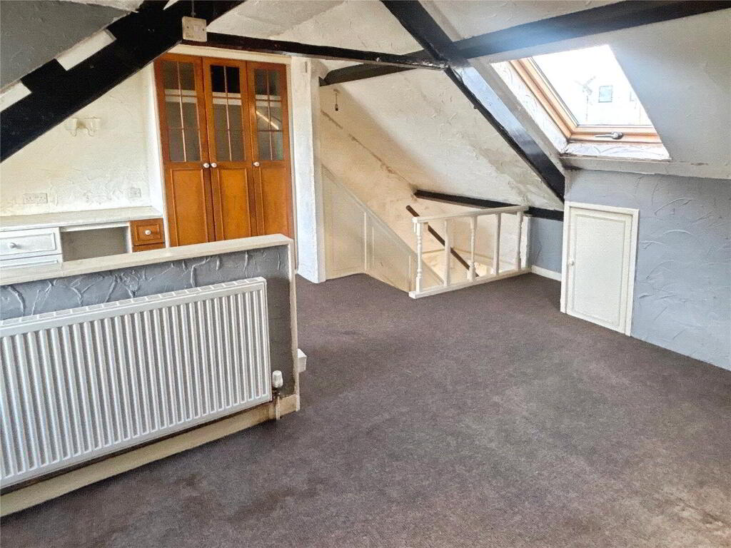 Upstairs, the first floor provides two double bedrooms together with a family bathroom. A further staircase leads to the top floor, where a particularly spacious bedroom with exposed beams and fitted furniture makes a characterful retreat.