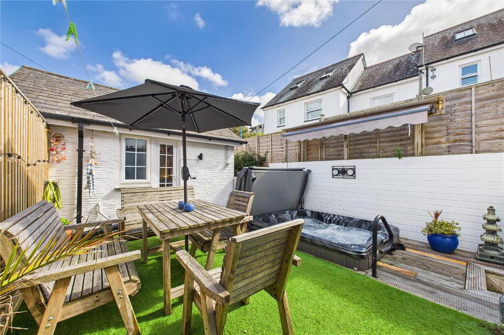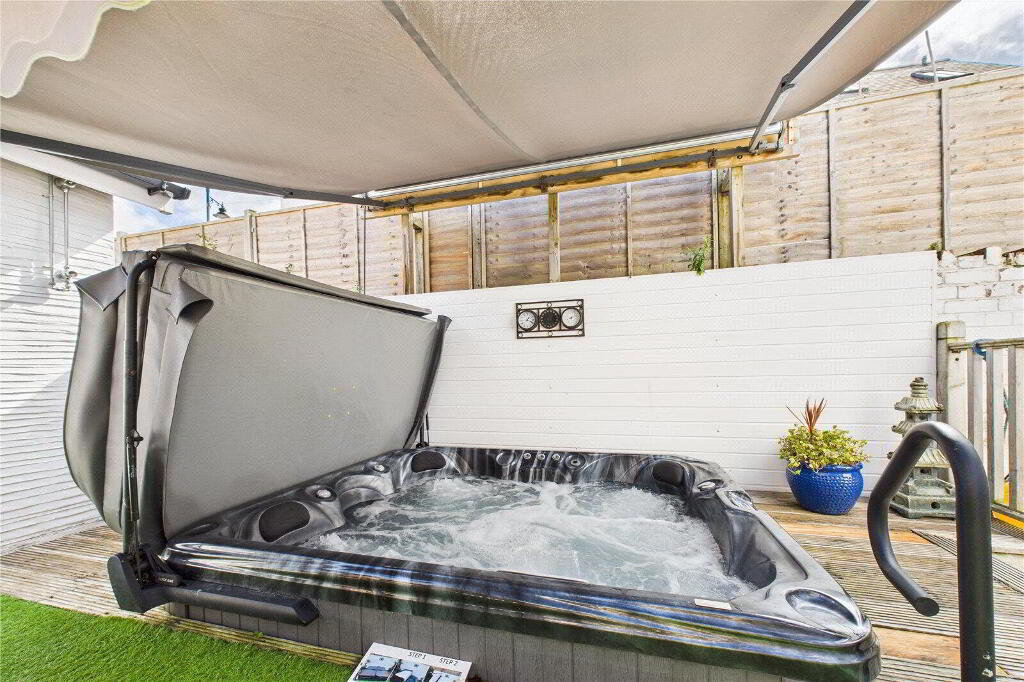 The outdoor spaces are equally impressive. To the rear, a peaceful walled garden provides the perfect setting for alfresco dining, while the elevated roof terrace is a true highlight. Bathed in sunshine and thoughtfully designed for low maintenance, it features a hot tub, outdoor shower and private screening, making it ideal for entertaining or simply unwinding in style.