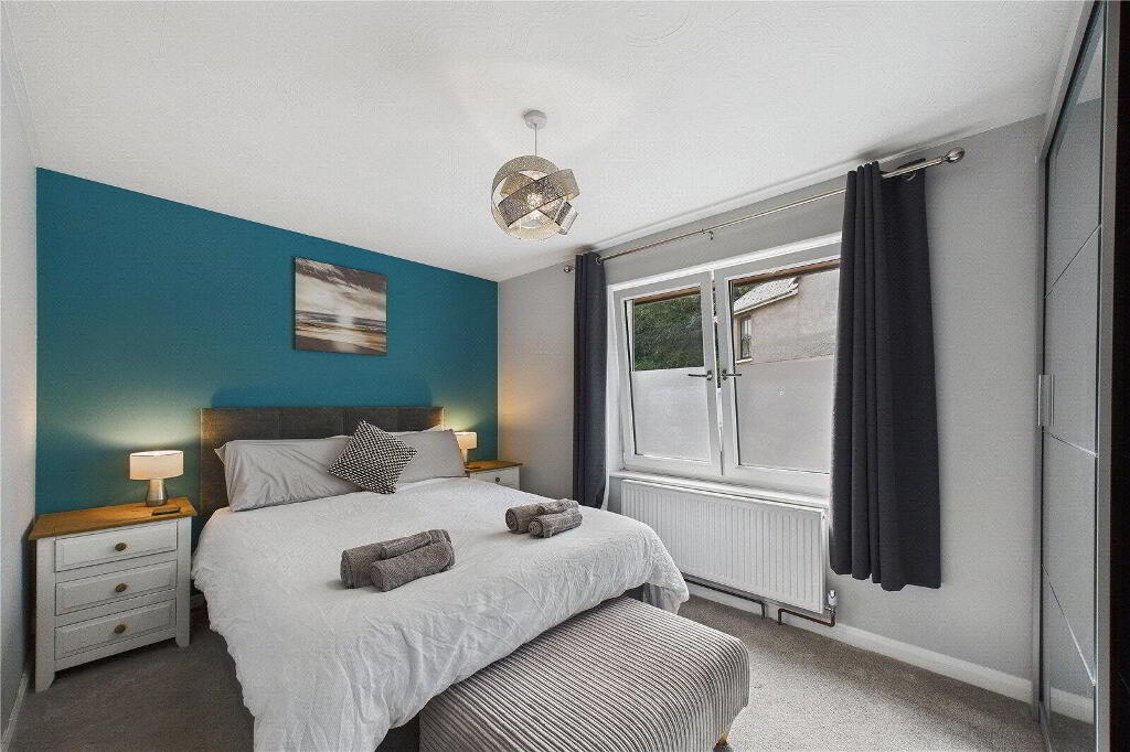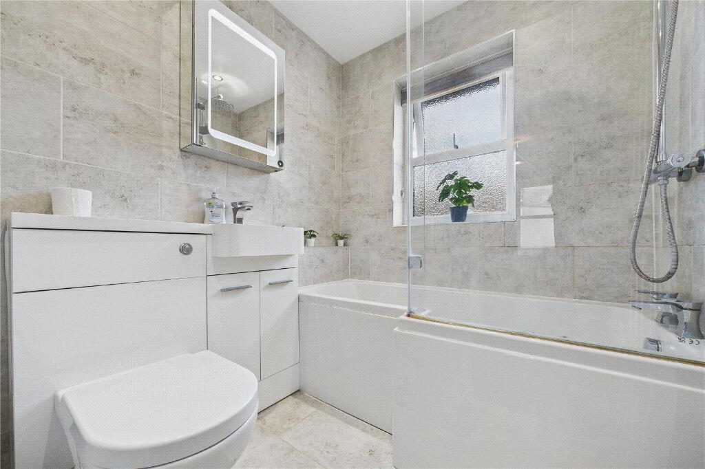 Upstairs, the property comprises two generously sized double bedrooms and a further single bedroom, all benefiting from a light and airy feel. The modern family bathroom is finished to a high standard, featuring a luxurious rain shower, a panel bath, and a heated towel rail for comfort and convenience.