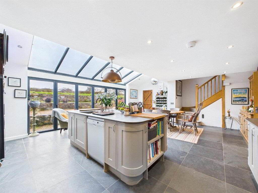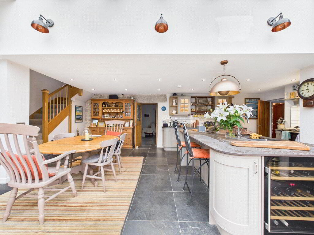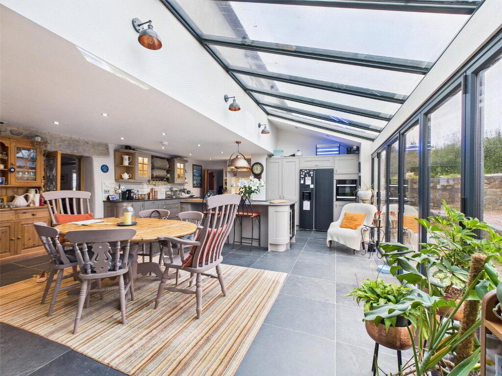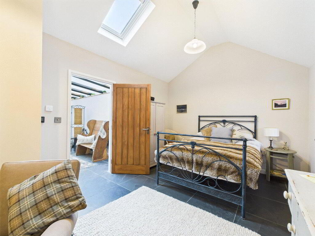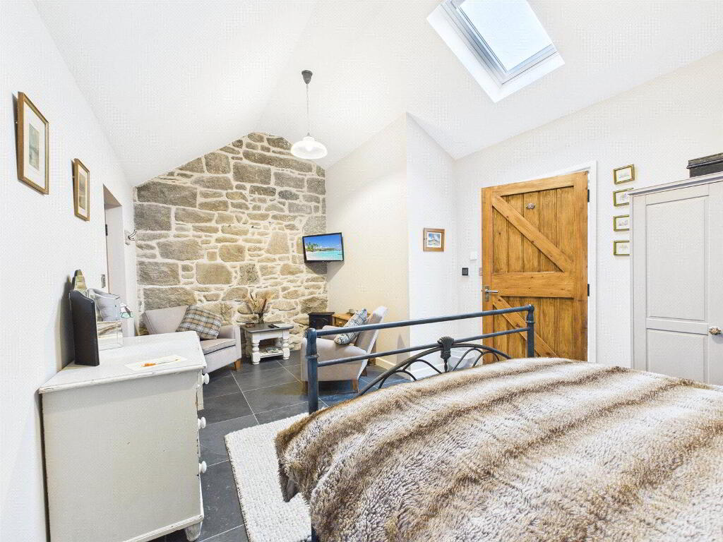 Step through the traditional porch to a welcoming living room with exposed stone walls and cosy wood-burning stove at one end plus a feature fireplace at the other. The large vaulted room then leads through to a light and spacious kitchen/dining area with plenty of room for family gatherings. Featuring a kitchen island and Everhot, the room blends character with practicality.