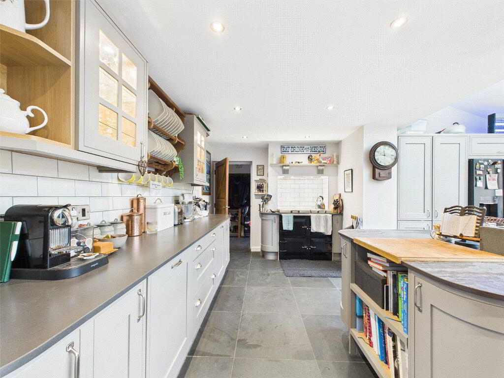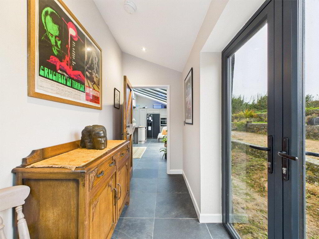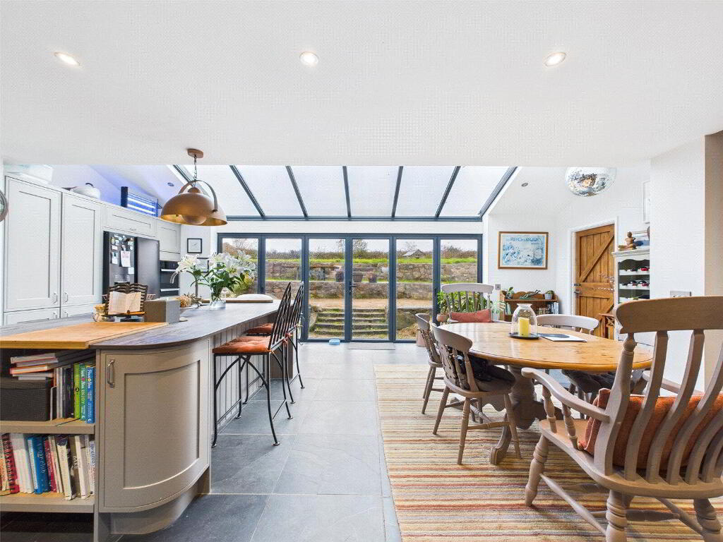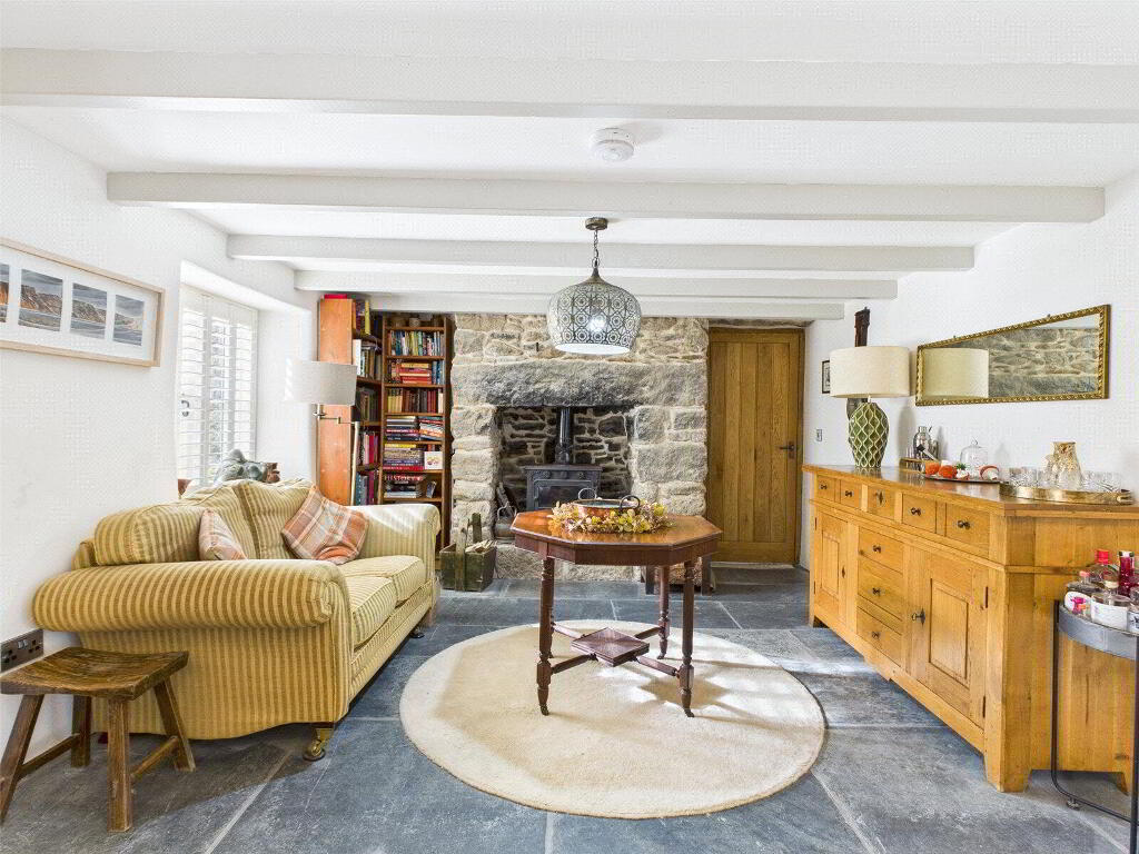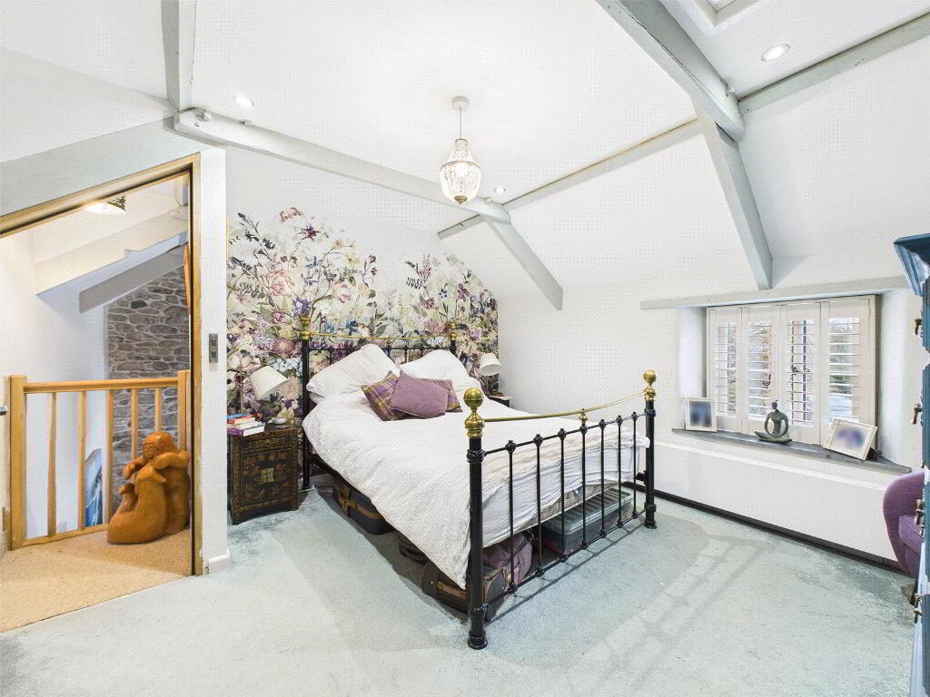Step through the traditional porch to a welcoming living room with exposed stone walls and cosy wood-burning stove at one end plus a feature fireplace at the other. The large vaulted room then leads through to a light and spacious kitchen/dining area with plenty of room for family gatherings. Featuring a kitchen island and Everhot, the room blends character with practicality.