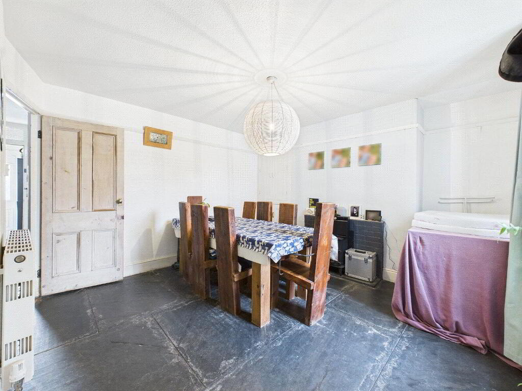 Moving back through the hallway, the dining room offers a similar footprint to the living room and provides a fantastic area for hosting dinners or family gatherings. A set of double windows look out to the rear garden, adding a pleasant sense of openness and connection to the outside.