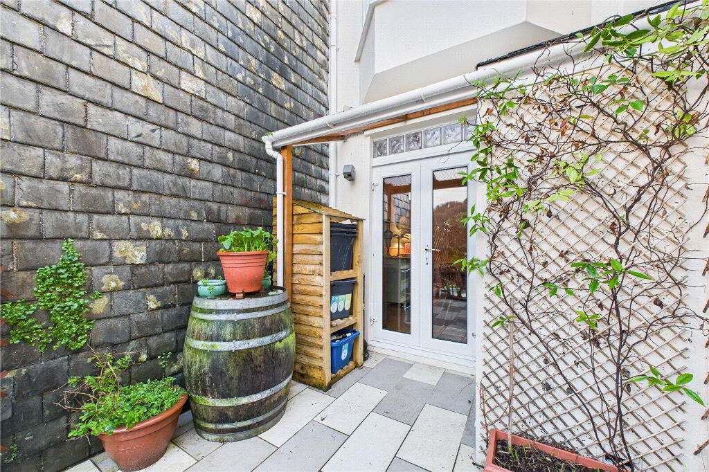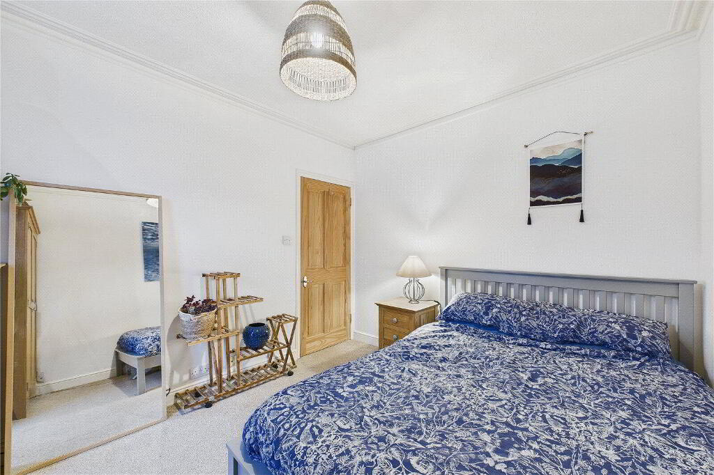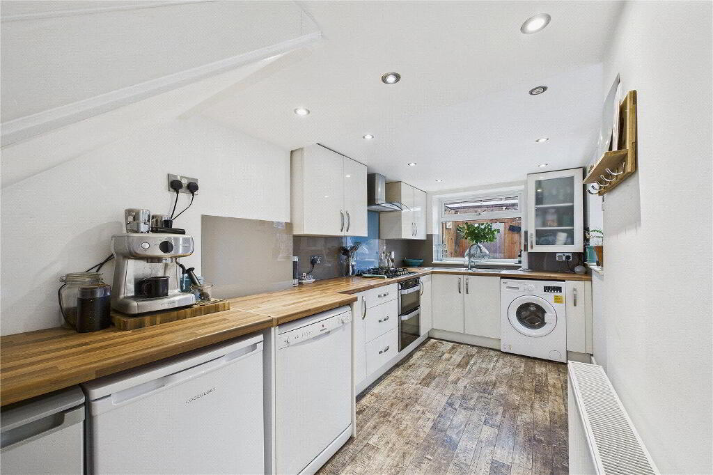 The kitchen is both warm and functional, fitted with wooden-effect countertops and offering further garden access, ideal for day-to-day living. The property benefits from a modern, well-equipped bathroom, complete with a rainfall shower and panelled bath.