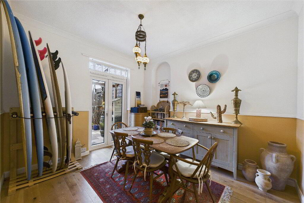 The interior has been thoughtfully updated by the current owners, showcasing exposed wooden flooring, abundant natural light and a seamless flow between rooms. The house benefits from two spacious reception rooms: the first featuring large windows that flood the space with light, and the second offering a direct outlook over the garden with convenient access outside—making it perfect for dining or entertaining.