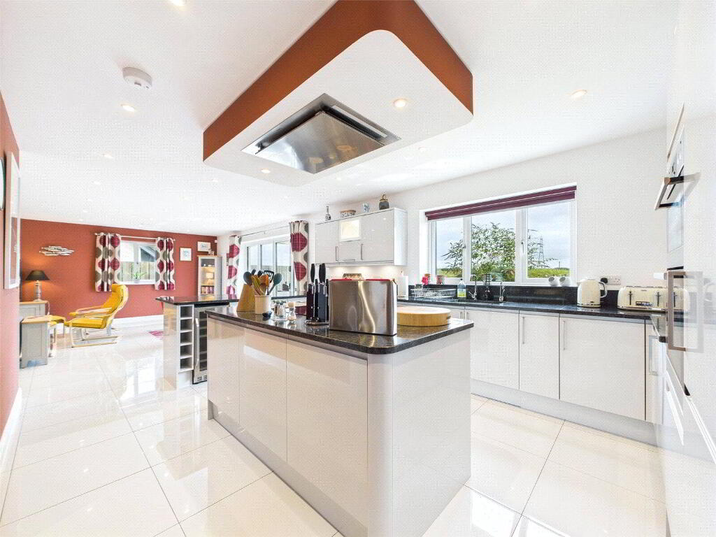 The heart of the home is the impressive open-plan kitchen, dining, and living space, designed for modern living and entertaining. The high-end kitchen is fully equipped with integrated appliances including a fridge/freezer, dishwasher, and wine fridge. Bi-fold doors open onto a private rear garden with patio, creating a seamless indoor-outdoor living experience.