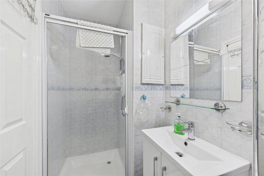The bathroom is neatly appointed with a WC and a walk-in single shower cubicle, providing a clean and functional space.
