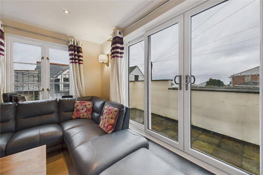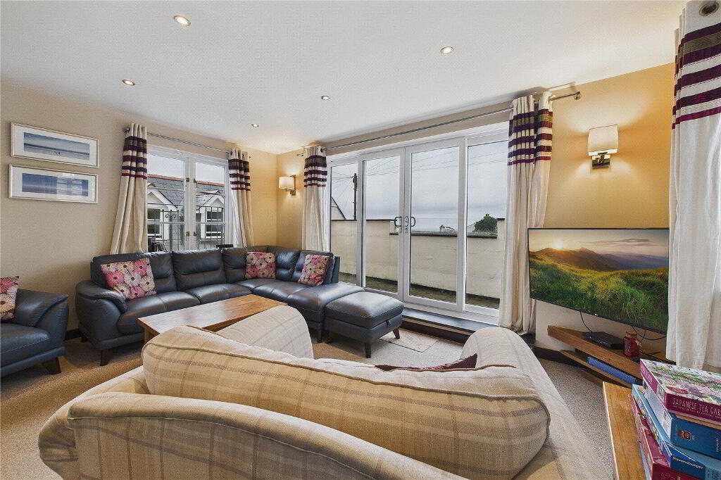 The kitchen is thoughtfully designed, fitted with integrated appliances and tiled splashbacks, creating a bright, practical and well-proportioned space ideal for everyday use or entertaining. The lounge is a standout feature of the home, boasting a dual-aspect layout with Juliet balconies that frame stunning sea views, flooding the room with natural light and creating a warm yet airy living environment.