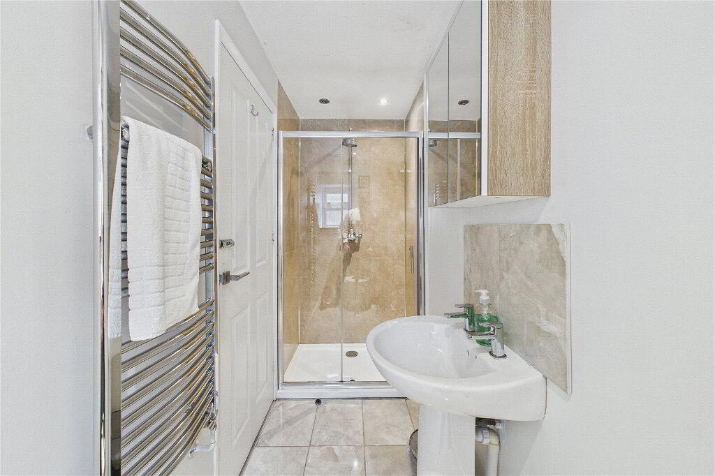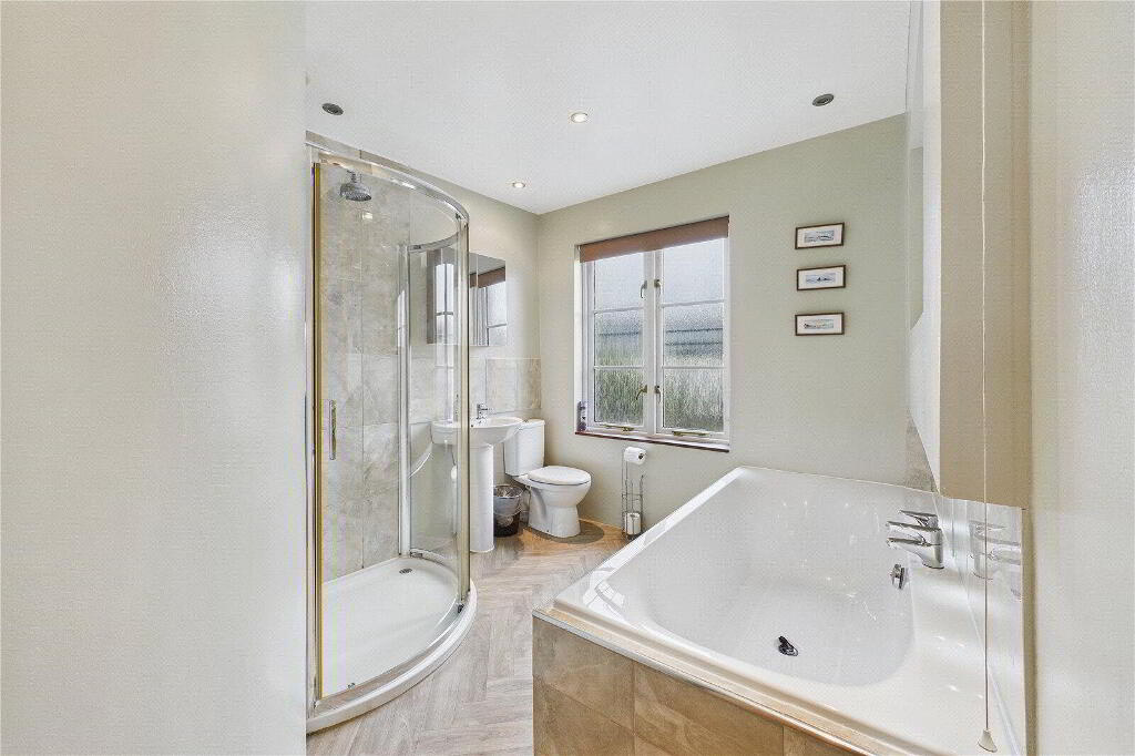 There are three modern bathrooms in total, all spacious and well finished. The main bathroom is fitted with a stylish back-to-wall bath alongside a separate shower cubicle, while the en-suite bathrooms include contemporary shower cubicles and heated towel rails.