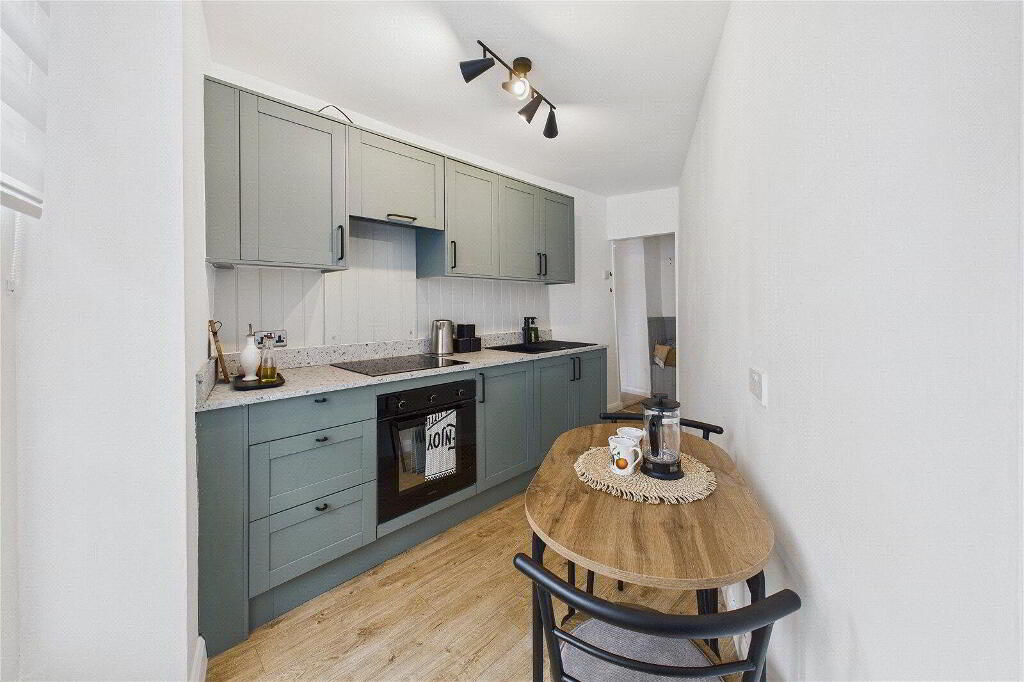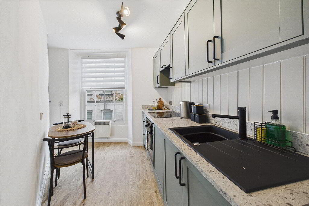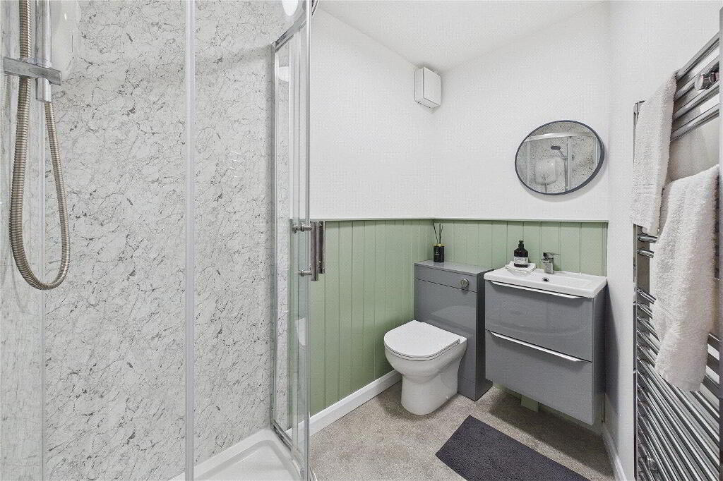 The accommodation includes a well-designed kitchen, thoughtfully arranged to maximise space and functionality, and finished with terrazzo-style worktops, good natural light and useful utility area. The bathroom is modern and stylish, fitted with a rainfall shower and heated towel rail, offering a clean and contemporary finish.