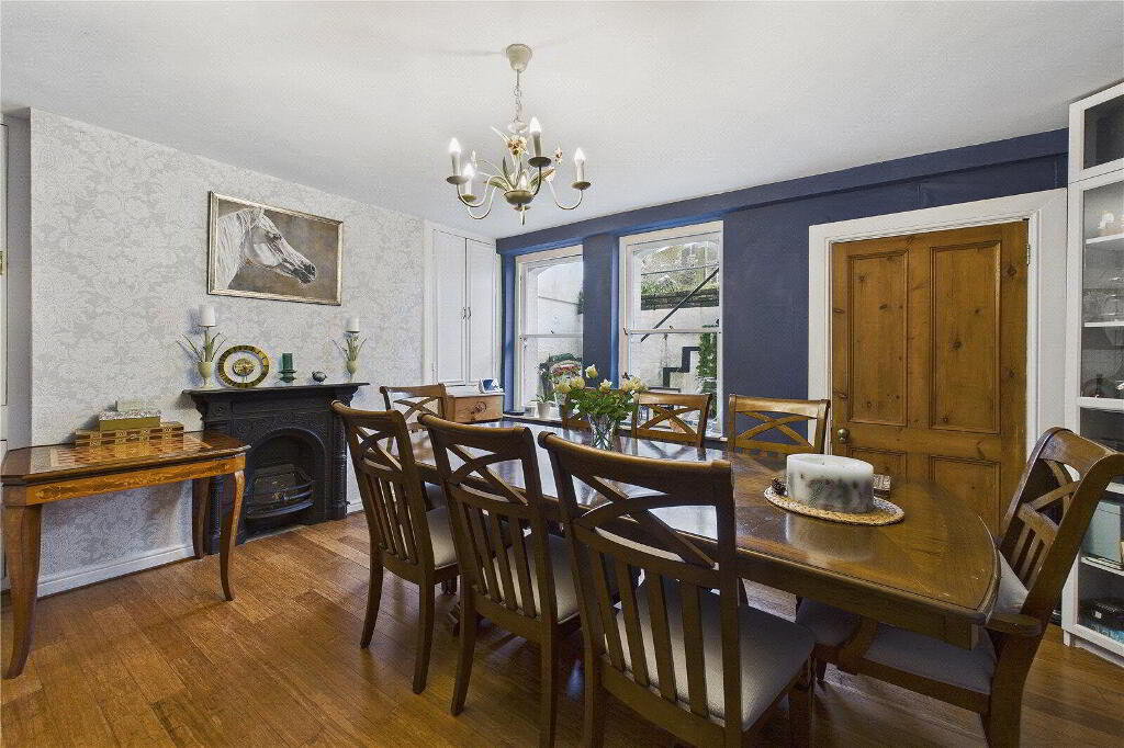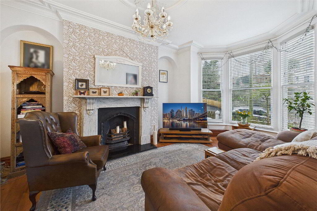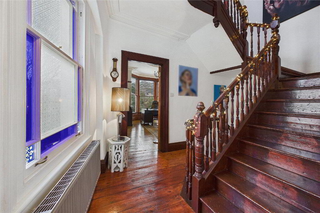 The ground floor opens into a welcoming entrance hallway, enhanced by stained-glass detailing and exposed wooden floorboards that immediately reflect the home’s Victorian heritage. This level includes the main living room with a character fireplace and a versatile fifth bedroom, currently utilised as a study or home office.
