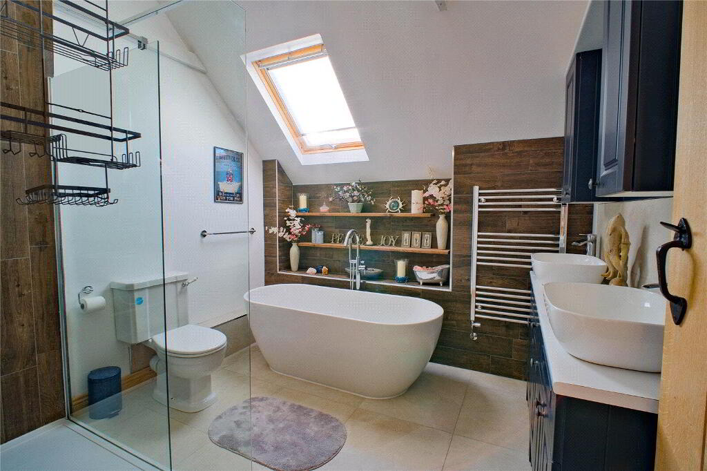 The ground floor centres around 2 generous Reception Rooms, both featuring log burners that form natural focal points and make the spaces ideal for year-round use. The main Lounge / Diner is perfectly proportioned for entertaining and everyday family life, while a separate Sitting Room offers a more intimate retreat, with doors opening directly onto the surrounding gardens and countryside beyond. The Kitchen is well-suited to hosting and family use, with a vaulted ceiling that floods the space with natural light and enhances the feeling of openness. A useful Utility Room and a ground floor Shower Room complete the lower level, adding further convenience and flexibility.