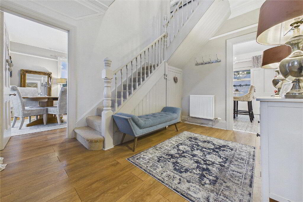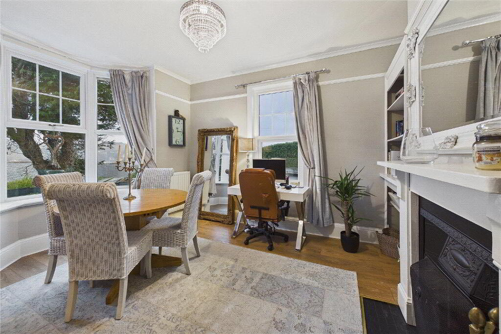 The entrance hall is inviting and full of presence, centred around a graceful L-shaped staircase with spindle balustrade that hints at the space beyond. The main sitting room enjoys a dual aspect with lovely natural light and far-reaching views towards the Bristol Channel, making it a perfect place to unwind beside the fire. A second reception room offers flexibility and intimacy, ideal as a snug, dining room or home office, again benefiting from its own character fireplace and a wonderfully cosy feel.