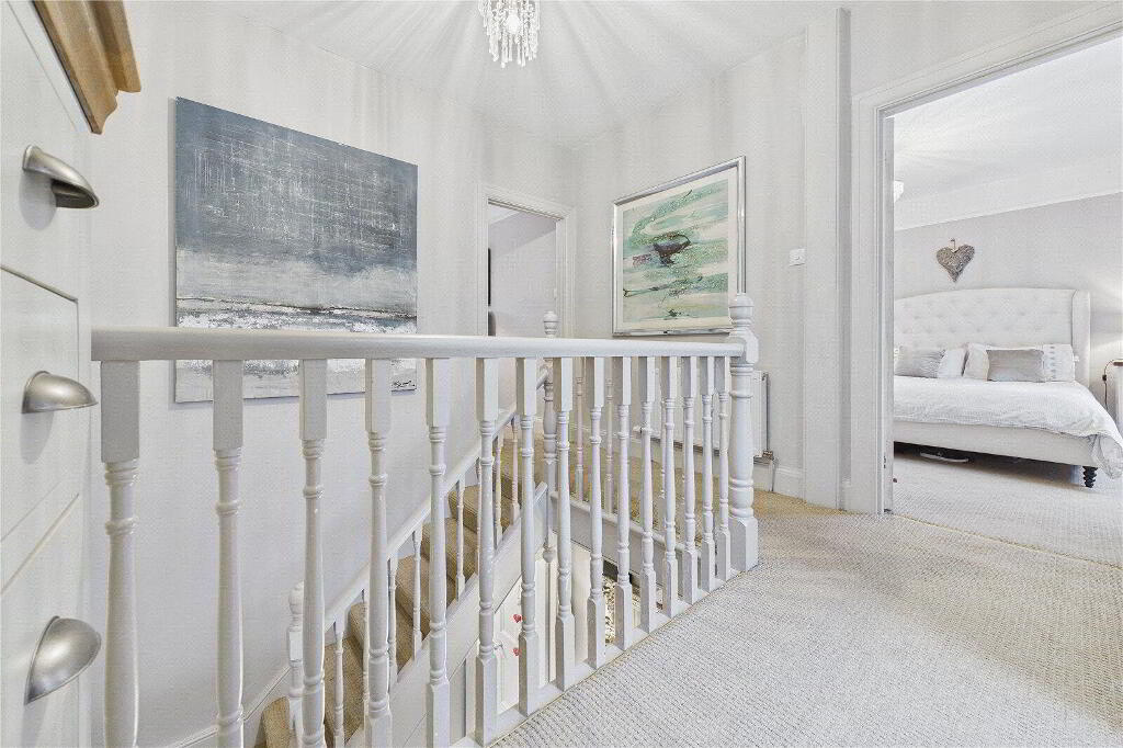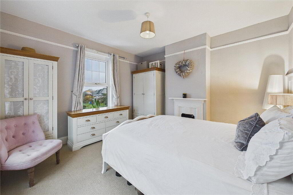 Upstairs, three generous double bedrooms provide calm and comfortable accommodation, with the principal bedroom enjoying stunning sea and countryside views. The family bathroom is fitted with a classic three-piece white suite.