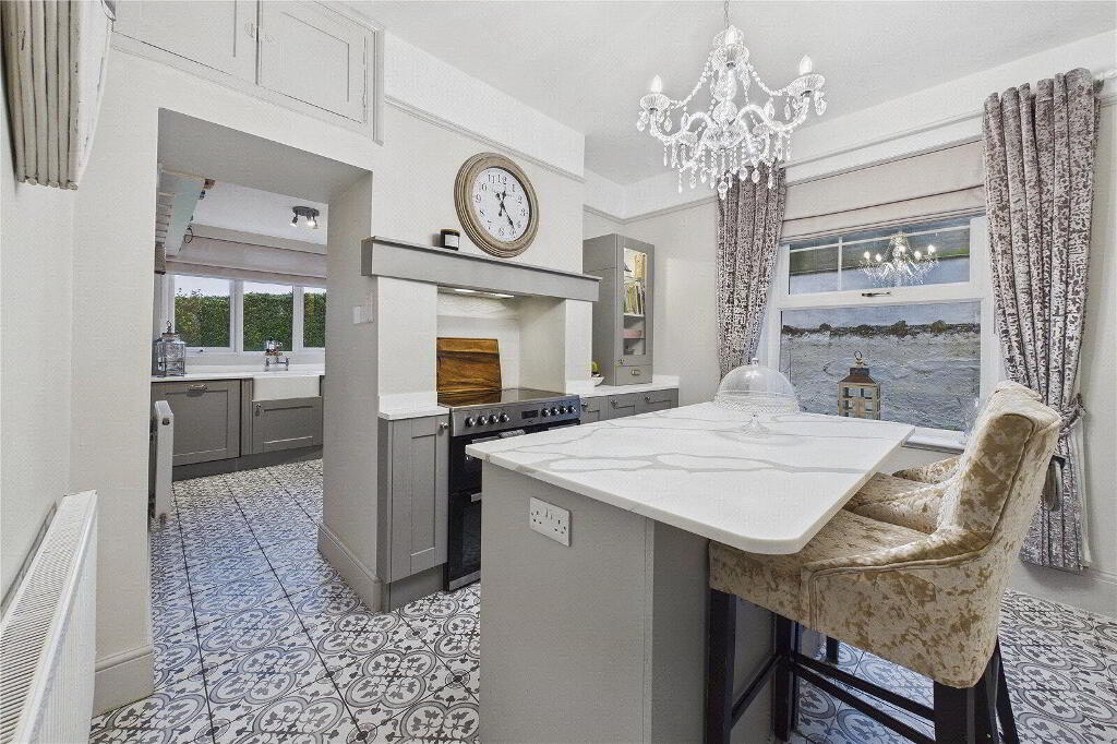 The kitchen is the heart of the home, fitted with solid ash units, Corian worktops and a central island that lends itself to everyday family life and relaxed entertaining. From here, a useful utility room leads through to a practical ground floor shower room with WC.