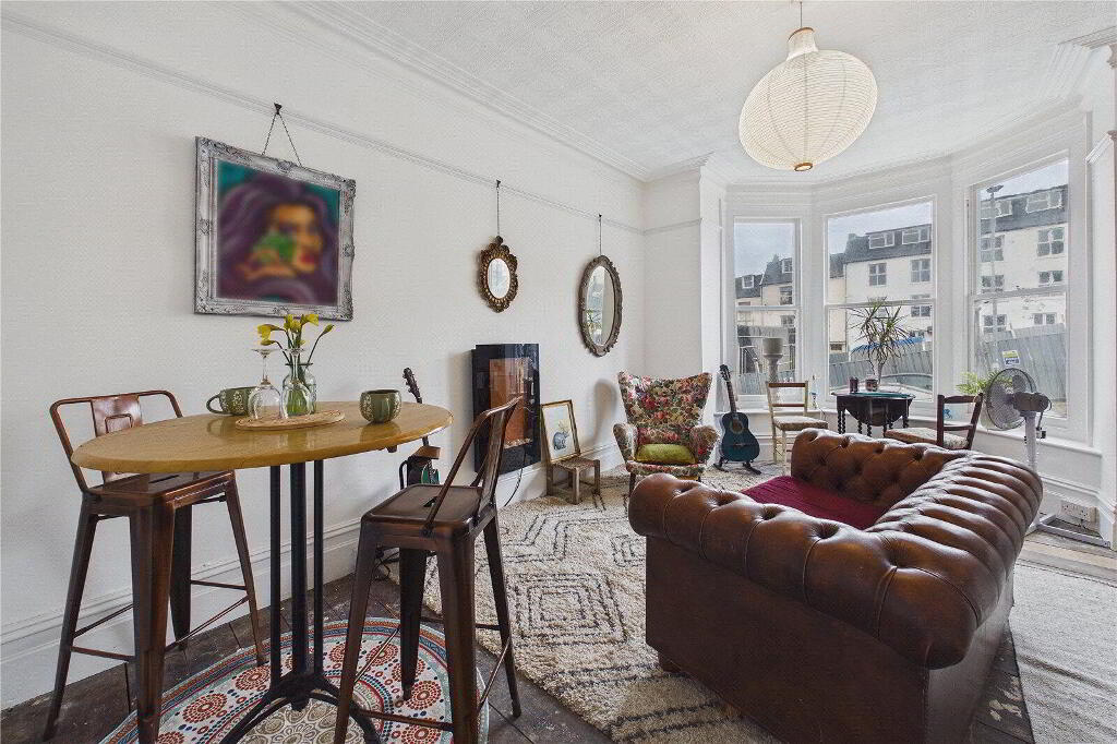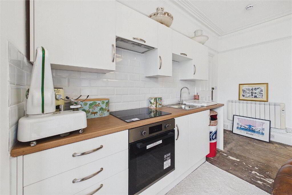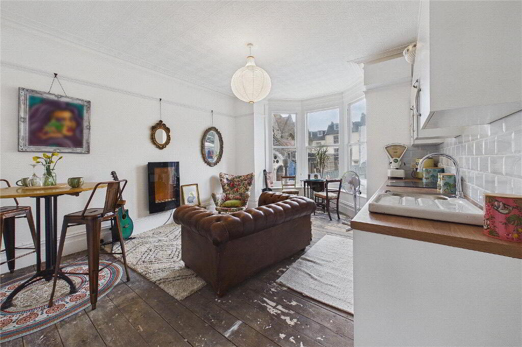 Full of character, the property retains attractive period features including exposed wooden floorboards, high ceilings and generous windows that flood the living space with natural light. The accommodation is arranged in an open-plan style, seamlessly combining the reception area, dining space and kitchen to create a bright and sociable layout ideal for modern living.