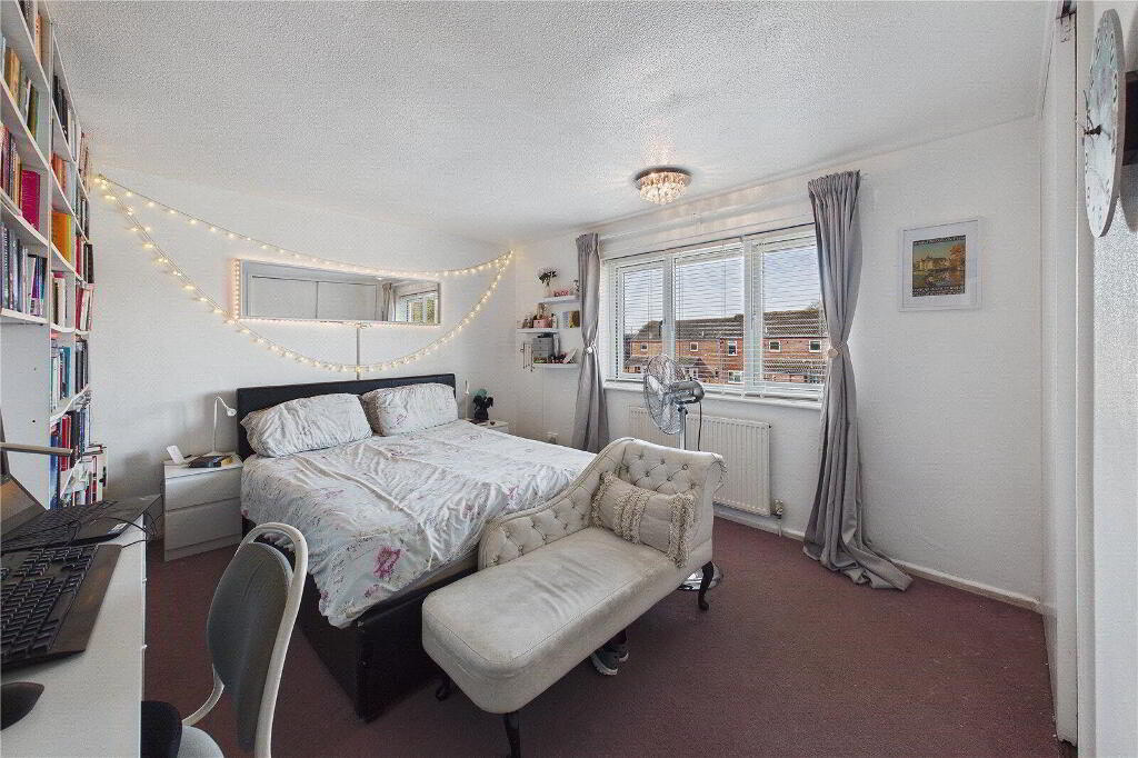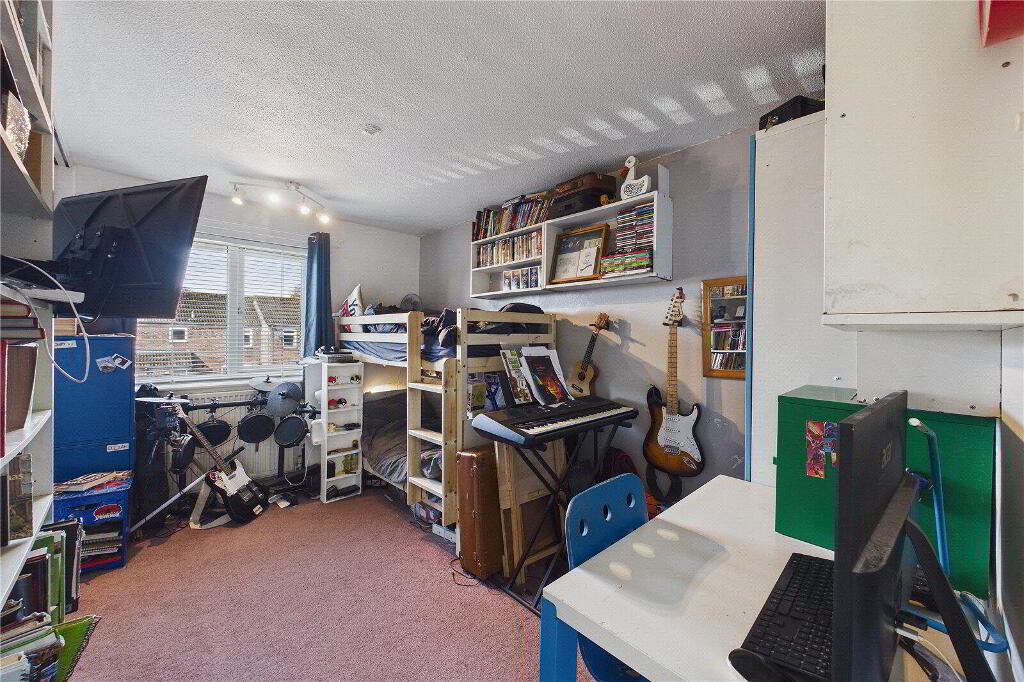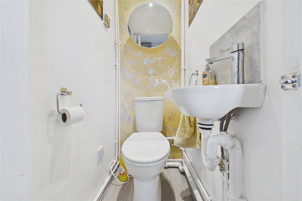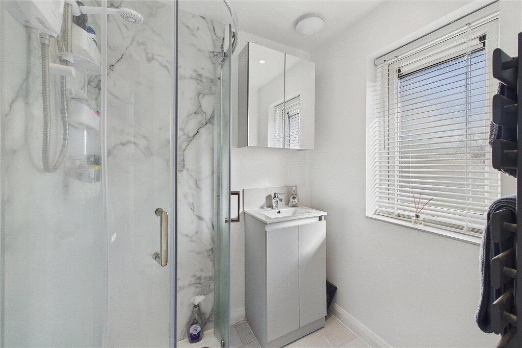 To the first floor are three well-proportioned bedrooms. The principal bedroom offers fitted wardrobe space, while bedroom two also benefits from built-in storage. The contemporary shower room has been stylishly fitted with a corner walk-in shower, vanity basin and heated towel rail. A separate first-floor WC adds further practicality for family living.