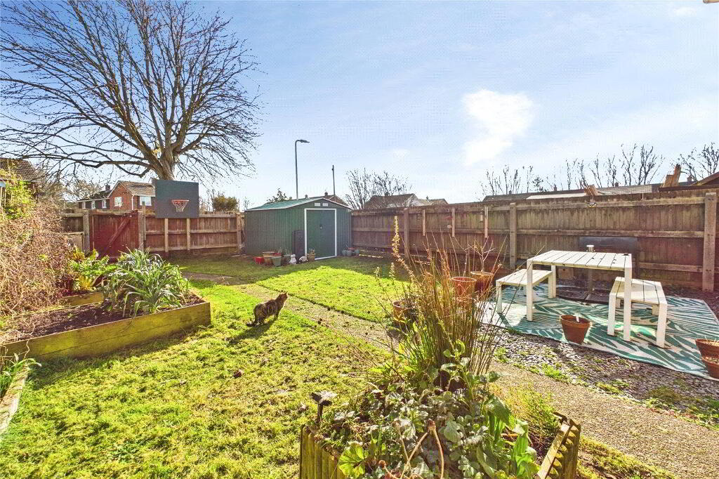Externally, the property enjoys a neat lawned frontage with attractive shrub borders, enhancing its kerb appeal. The fully enclosed rear garden is predominantly laid to lawn with a paved patio area — ideal for outdoor dining, children, or pets. A rear gate provides direct access to the communal parking area where two allocated spaces offer both convenience and security.
