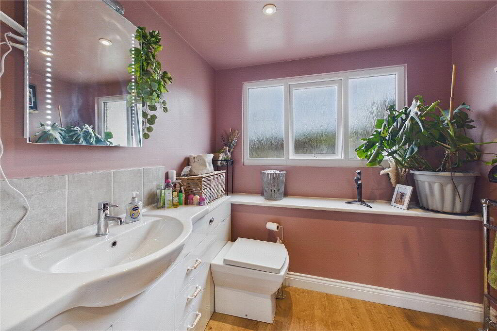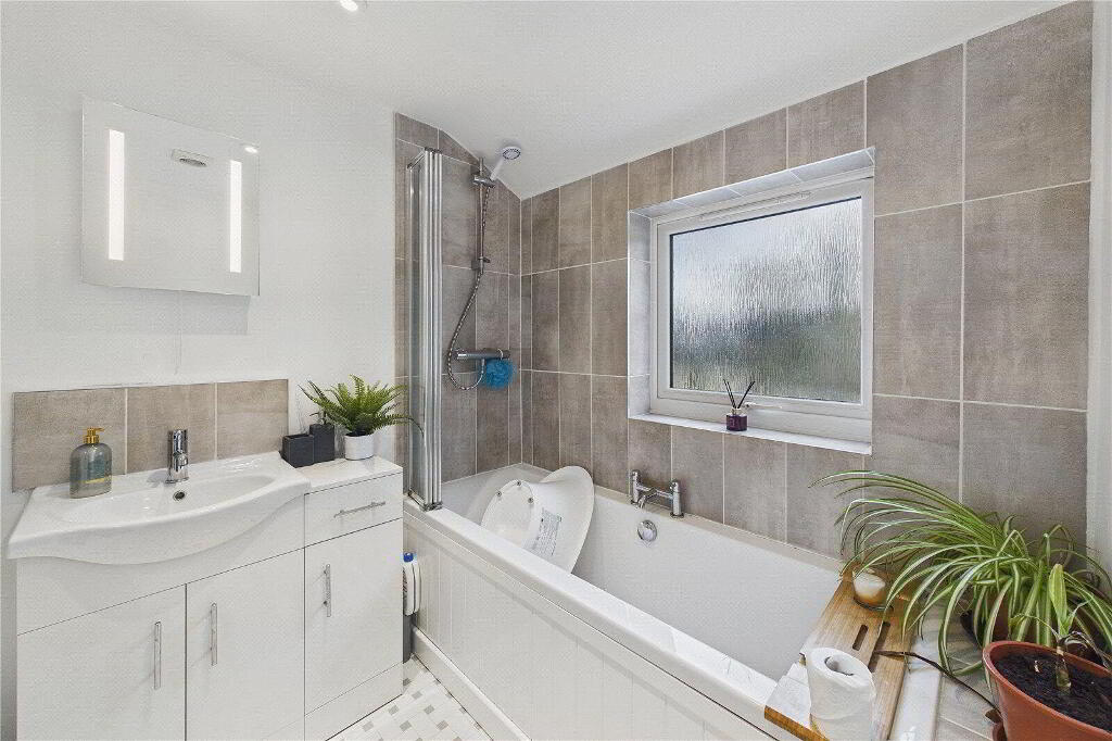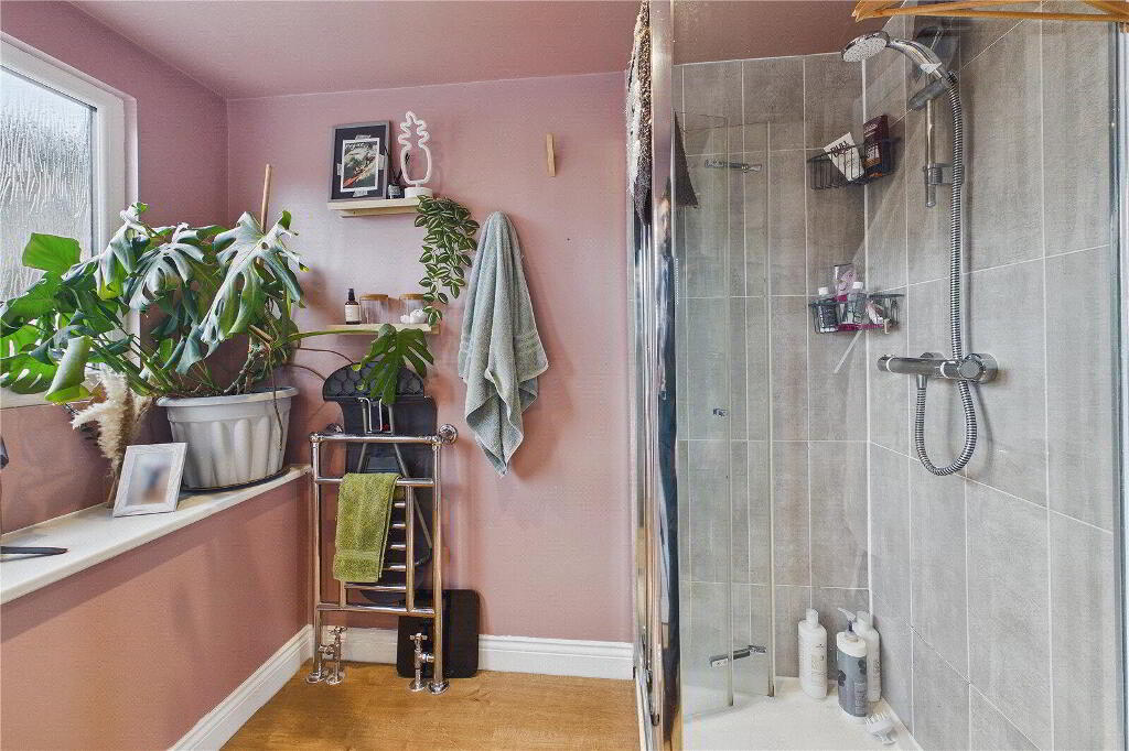 The accommodation comprises four bedrooms, including three generous doubles and one single, making the property ideal for families or those requiring a home office or guest room. The principal bedroom benefits from fixed wardrobes and a modern ensuite shower room with rain shower, while the family bathroom is fitted with a panel bath, rain shower and heated towel rail. Additional fixed wardrobes will remain in place, and the property will be offered partly furnished, providing a convenient move-in option.