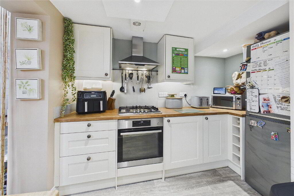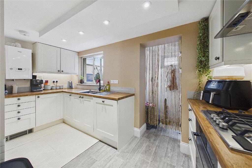 The property features a bright and welcoming open-plan reception room, enhanced by a large bay window and useful built-in storage, creating a practical living and dining space ideal for everyday use. The adjoining kitchen is well appointed with wood worktops, excellent natural light, and provides access to a separate utility room, adding further convenience.