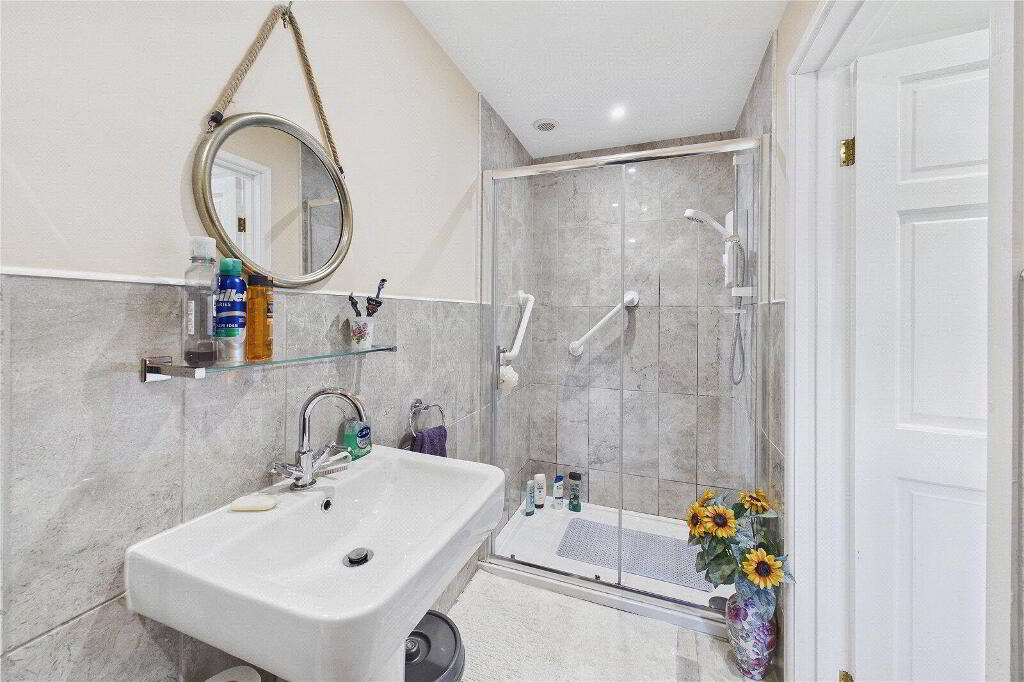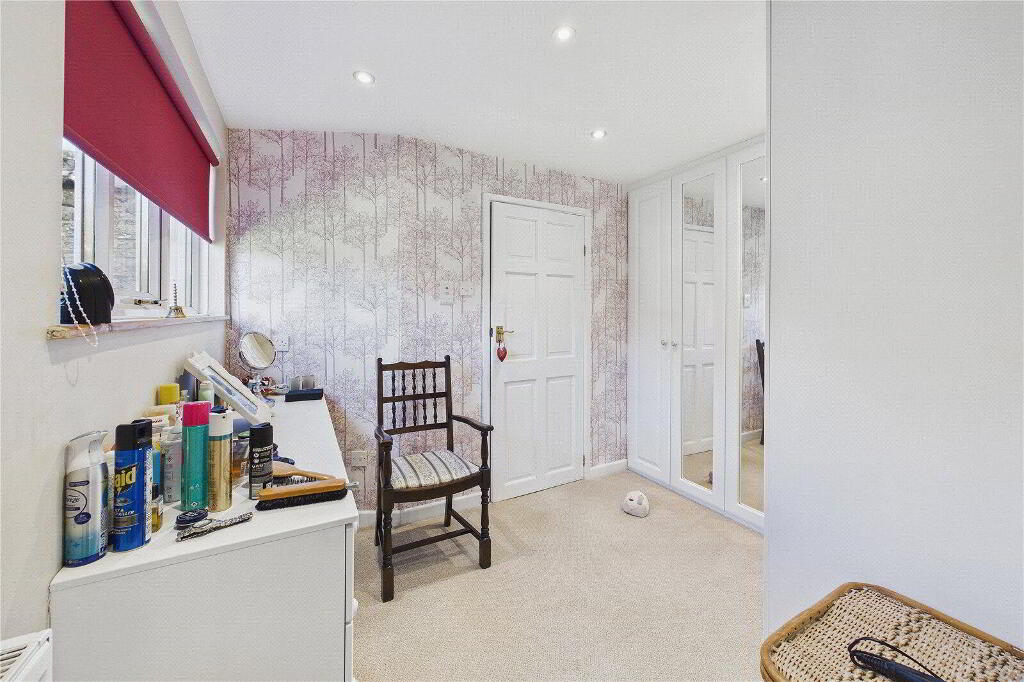 The principal bedroom is a particularly appealing feature, benefiting from direct access to the garden alongside a walk-in wardrobe and a stylish en-suite shower room with a level walk-in shower and heated towel rail. There are three further spacious double bedrooms, together with a modern family bathroom finished to a high standard.