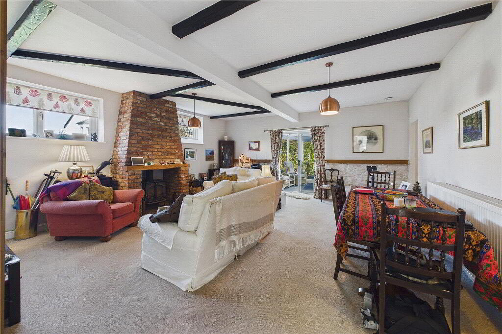 The ground floor is centred around a generous open-plan reception room where large windows flood the space with natural light and a striking brick fireplace provides a warm focal point. To the rear of the property, the kitchen is positioned within a bright conservatory-style room, creating a wonderful living space that enjoys views over the garden and a strong connection to the outdoors — ideal for both everyday living and entertaining. The layout is both flexible and practical, making the property equally well suited as one substantial family home or as a home with separate living accommodation if desired.