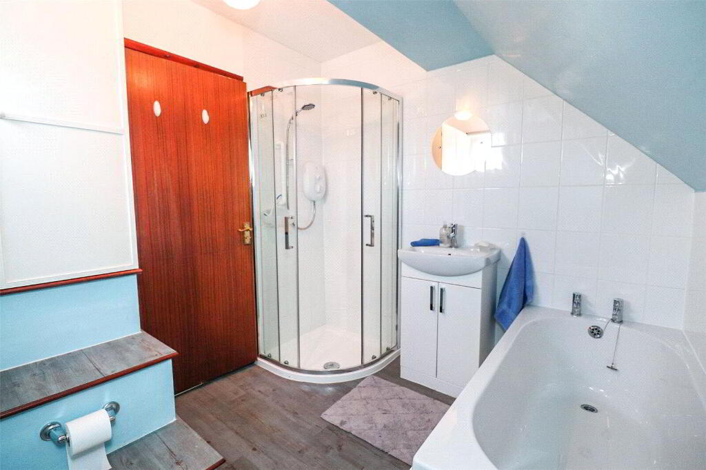 A fully fitted suite comprising panel bath, seperete shower cubicle with "Mira" electric shower over, vanity unit with inset wash hand basin and low flush WC. Heated towel rail and useful storage cupboard. Window to side elevation.