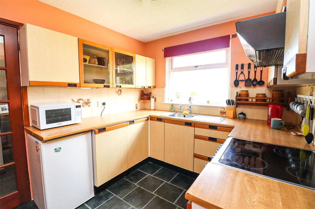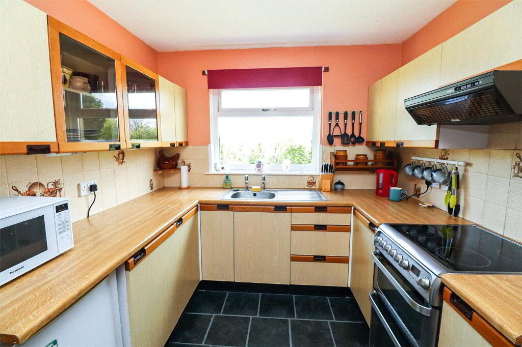 Fitted with a range of matching wall and base mounted unit with work surfaces over, incorporating a stainless steel sink drainer unit and electric oven with extractor over. Space for under counter fridge. Access to useful understairs storage area. Window to rear elevation over looking the rear garden and enjoying far reaching countryside views beyond.