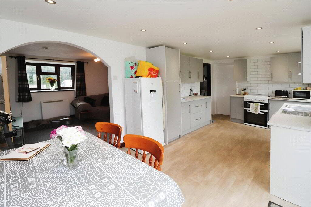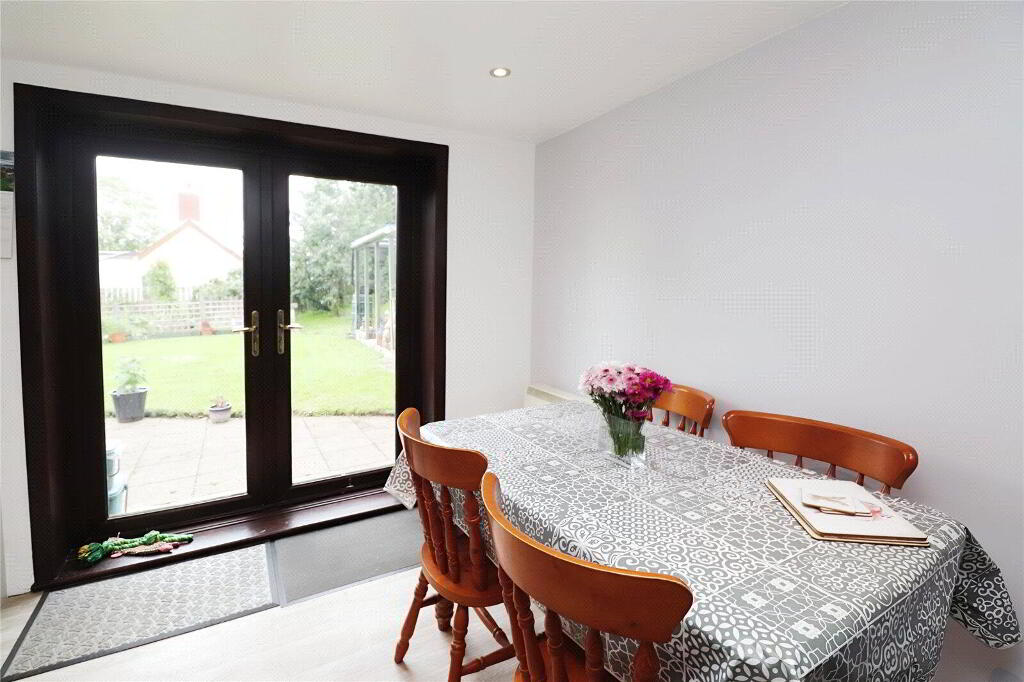 A newly fitted kitchen comprising matching wall and base mounted units with work surfaces over incorporating a stainless steel 1 1/2 sink drainer unit with mixer tap. Space for free standing fridge freezer, electric/LPG cooker and dishwasher. Ample room for dining room table and chairs. Access to useful under stairs storage cupboard. Internal door to garage. Double glazed French patio doors, single door and window to rear elevation.