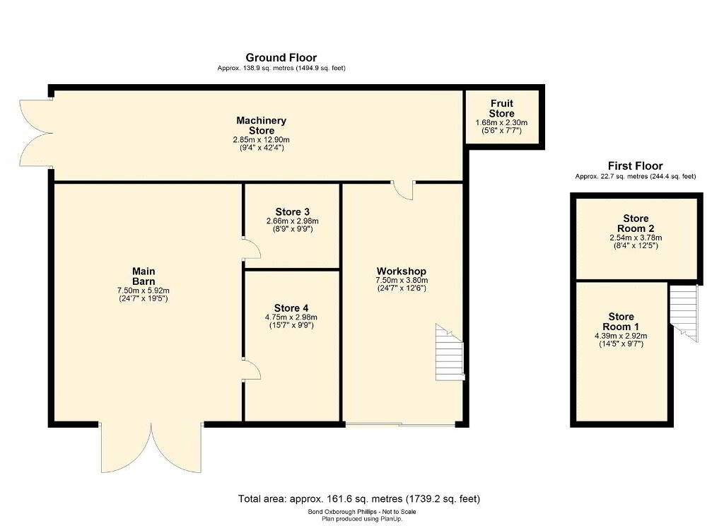 - Workshop 7.2m x 3.86m (23’7 x 12’8) With light and power. Stairs leading to first floor; Store Room 1 14' 5 x 9' 7 (4.39m x 2.92m) With light and power connected. Store Room 2 12' 5 x 8' 4 (3.78m x 2.54m) Light and power connected. The Main Barn 30’ x 25’ (9m x 7.5m) Machinery Store 42’ x 9’3 (12.8m x 2.85m) Open fronted hay store 26' 7 x 11' 8 (8.10m x 3.56m) With adjacent metal feed store. Both with light and power. Polytunnels 12m x 4.8m and 9m x 4.2m Field Shelter 12’1 x 11’8 (3.6m x 3.7m) Mains water. Fenced hard standing.