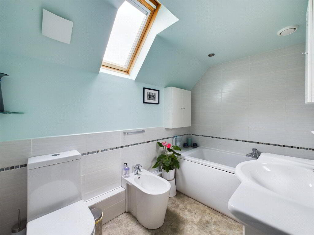 Close coupled WC and wash hand basin. Plumbing and recess for washing machine and tumble dryer. Window to front elevation. - First Floor Landing