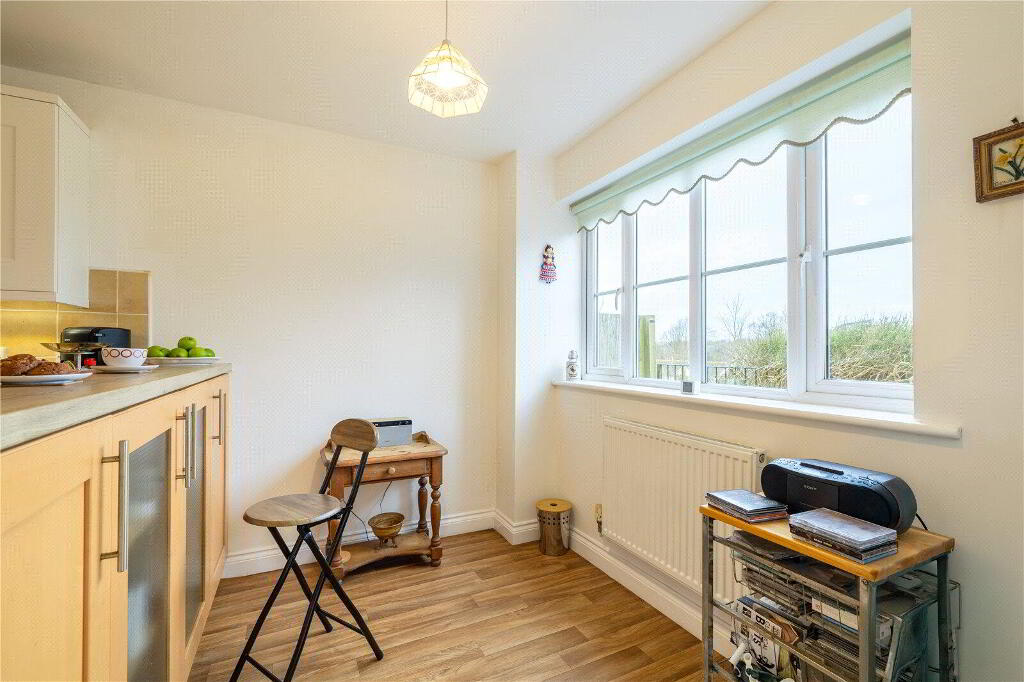 Equipped with a range of modern fitted units comprising 1.5 bowl stainless steel sink unit, worktop surfaces with storage cupboards, drawers and appliance space below, matching wall storage cabinets over, tiled splashbacking and worktop lighting. Built-in 4-ring gas hob with extractor canopy over, built-in electric double oven. Integrated fridge / freezer. Plumbing for washing machine. Radiator. - Breakfast Room