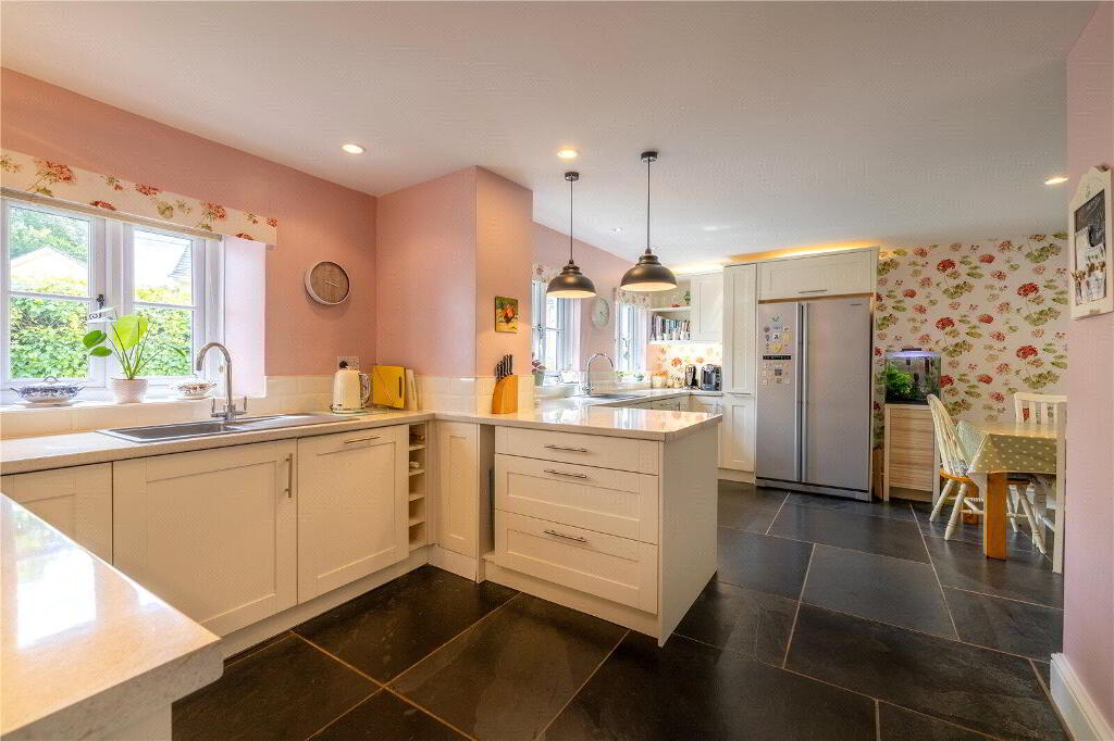 The heart of the home is undoubtedly the open-plan, dual aspect Kitchen / Diner. Updated by the current owners, it offers ample space for cooking and dining and is the perfect room for entertaining. With French doors opening from the dining area onto a patio, this room brings the outside in.