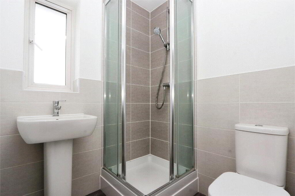 UPVC obscure double glazed window. Fully tiled corner shower enclosure, close couple dual flush WC and pedestal wash hand basin with mixer tap over. Radiator, extractor fan, wood effect vinyl flooring.
