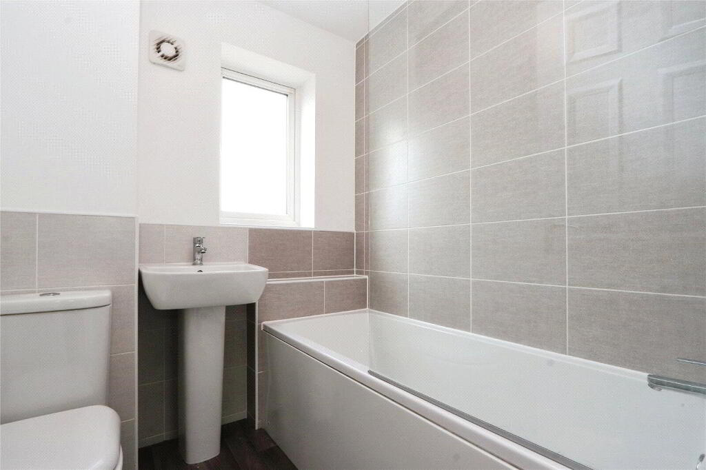 An attractive contemporary Bathroom with close couple dual flush WC, pedestal wash hand basin with mixer tap over and bath with mains shower over and full wall tiling to area. Extractor fan, radiator, wood effect vinyl flooring. UPVC obscure double glazed window.