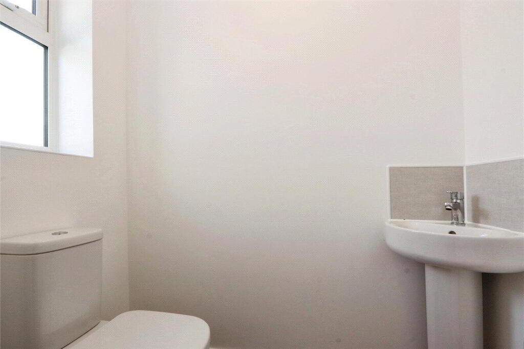 UPVC obscure double glazed window. Close couple dual flush WC and pedestal wash hand basin with tiled splashbacking. Radiator, wood effect vinyl flooring.