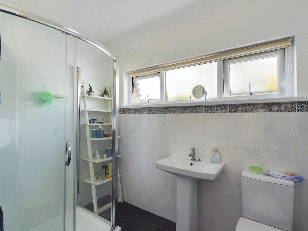 Double enclosed shower cubicle with mains fed shower over, low flush WC, pedestal wash hand basin, heated towel rail, opaque glazed window to side elevation. - Outside