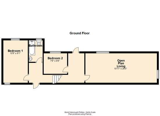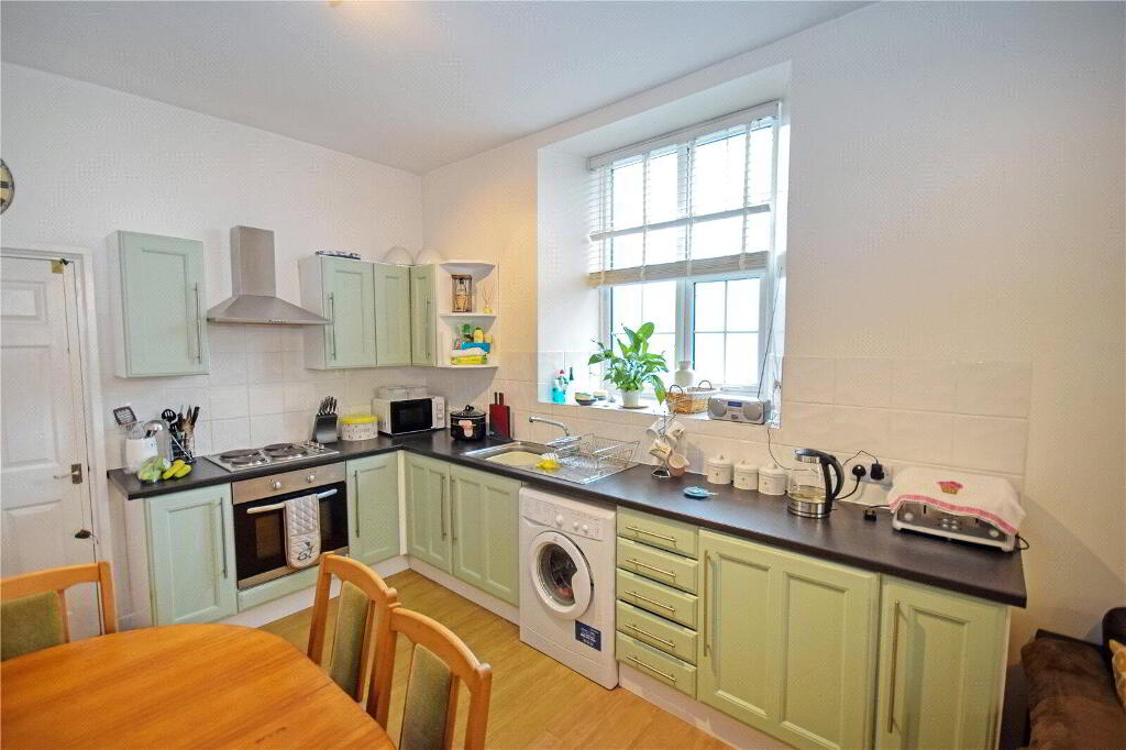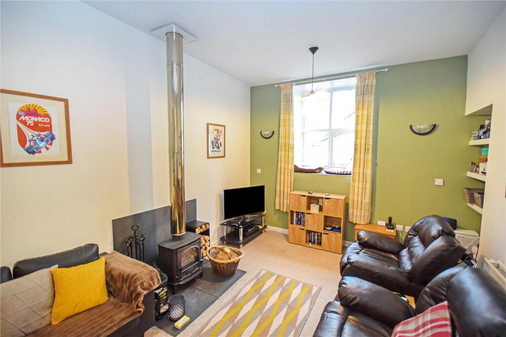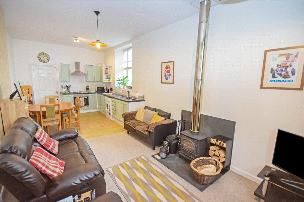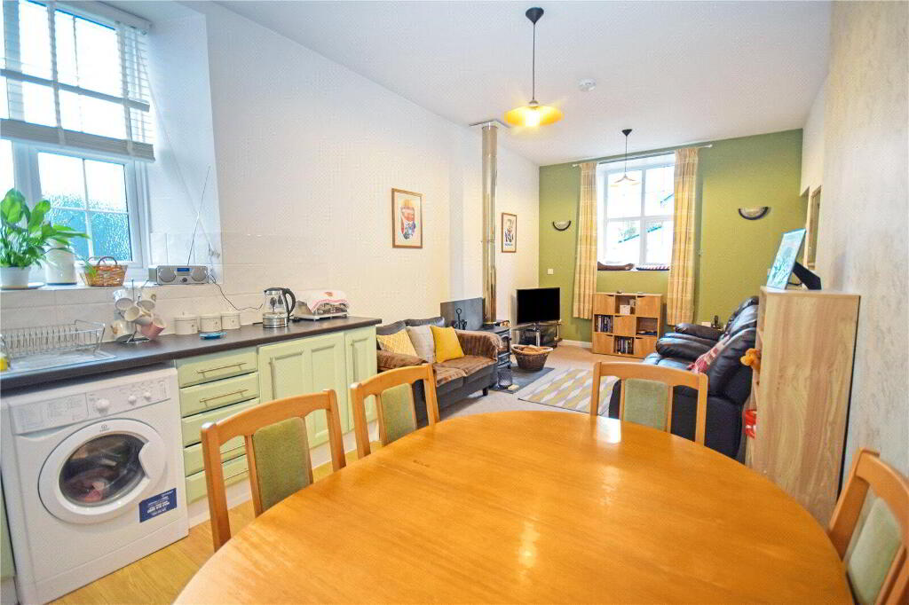 A small flight of stairs leads up to the remainder of the accommodation. A door leads to the second double bedroom. Then you are led into the open plan living area, the true heart of this period home. Upon entering, you are struck with the true volume of the room, emphasised by the high ceilings throughout and the amount of natural light filling the large space. To the front of the room, is the kitchen fitted with a range of base, wall and drawer units with contrast worktop. There is then an area for a dining room table before leading onto the sitting room area, with a feature woodburner.