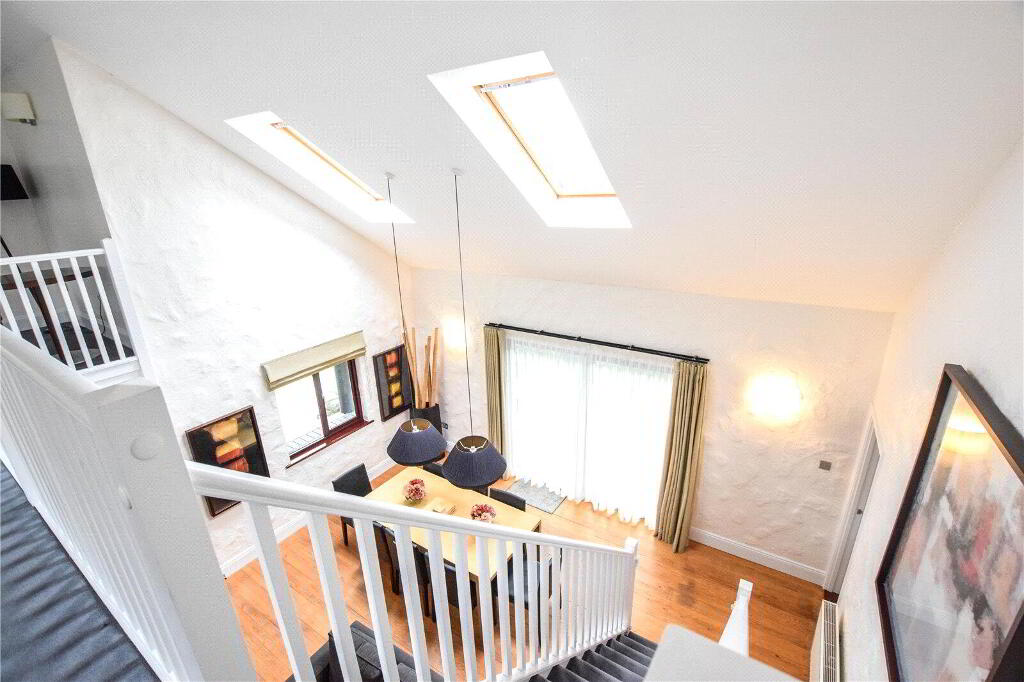 Upon entry to the property you are greeted by and entrance hallway with doors to the airing cupboard and utility and the living space. The living room is a truly impressive space. The room offers a vaulted ceiling to the front over the dining area, which seamlessly flows into the living space with feature fireplace and plentiful space for a range of furniture. The study space opens to the rear and again benefits from a vaulted ceiling with Velux windows to all sizes. The kitchen area is also open to the living space and offers a high quality finish in its range of built in units and appliances. Also on the ground floor are two sizable bedrooms with impressive en-suite bathrooms complete with bath, WC and hand basin.