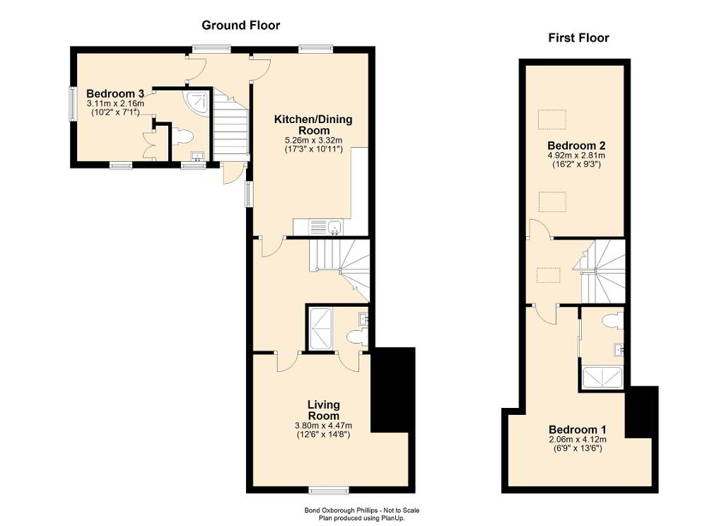 On the first floor there is a large kitchen/ dining room, a bedroom with an en suite and a living room, with the added benefit of another en suite, so therefore could be an additional fourth bedroom.