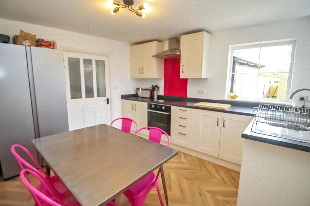 Range of base and wall units with worksurfaces over, incorporating a stainless steel 1 1/2 bowl sink/drainer unit with mixer tap. "Indesit" 4 ring ceramic hob with illuminated extractor and matching oven. Windows to front and side. - UTILITY ROOM