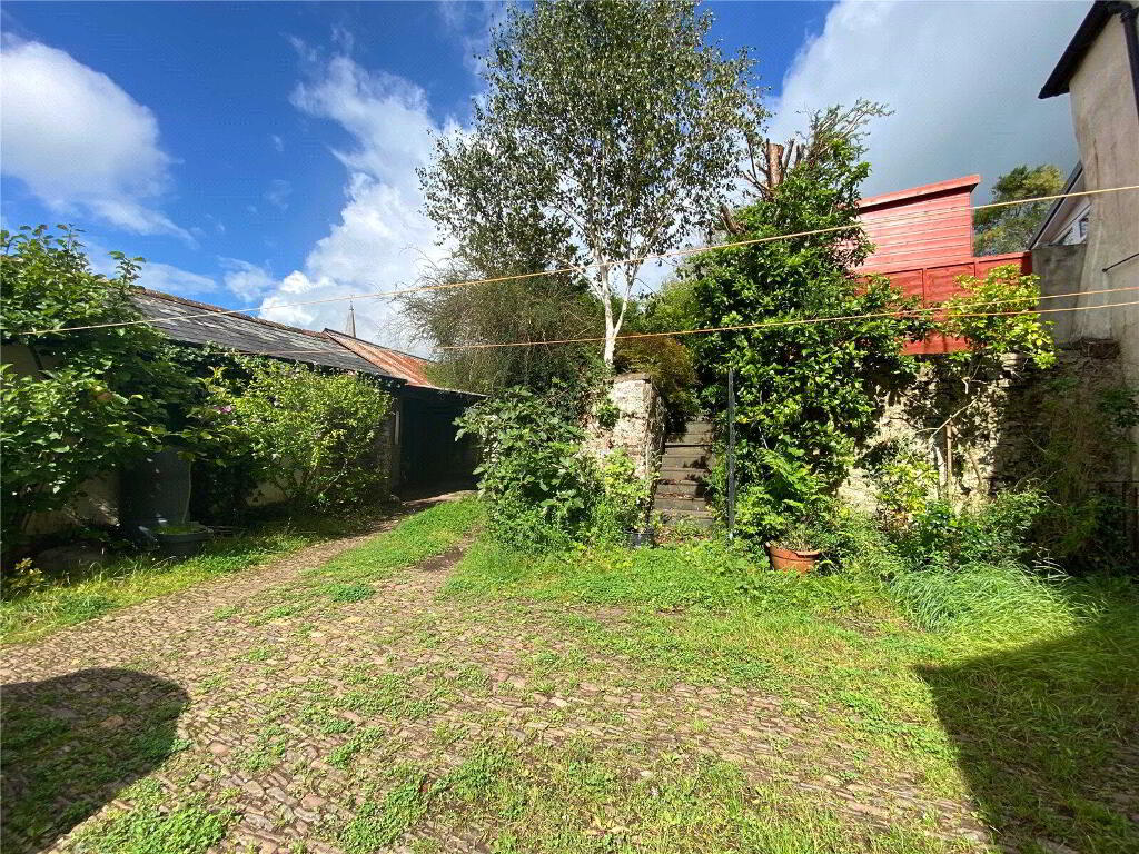 Original cobbled floor with stone and rendered wall boundaries, with wrought iron pedestrian gate and slate steps leading up to the garden and timber doors leading to two sheds, the first of which houses the boiler and measures 11'8 x 7'2, with side aspect, panel glazed window and floor mounted oil fired boiler for central heating, light and power connected, the second of which houses the oil tank and is currently used as a wood store, but could offer enclosed parking if required. From the shed is a barn like covered entrance with corrugated pitched roof and twin high level timber gates with low level pedestrian gate to the side and acts as a useful store or covered parking as required. Beyond here there are further steps leading to the gardens, and the rest of the driveway. - Rear Gardens