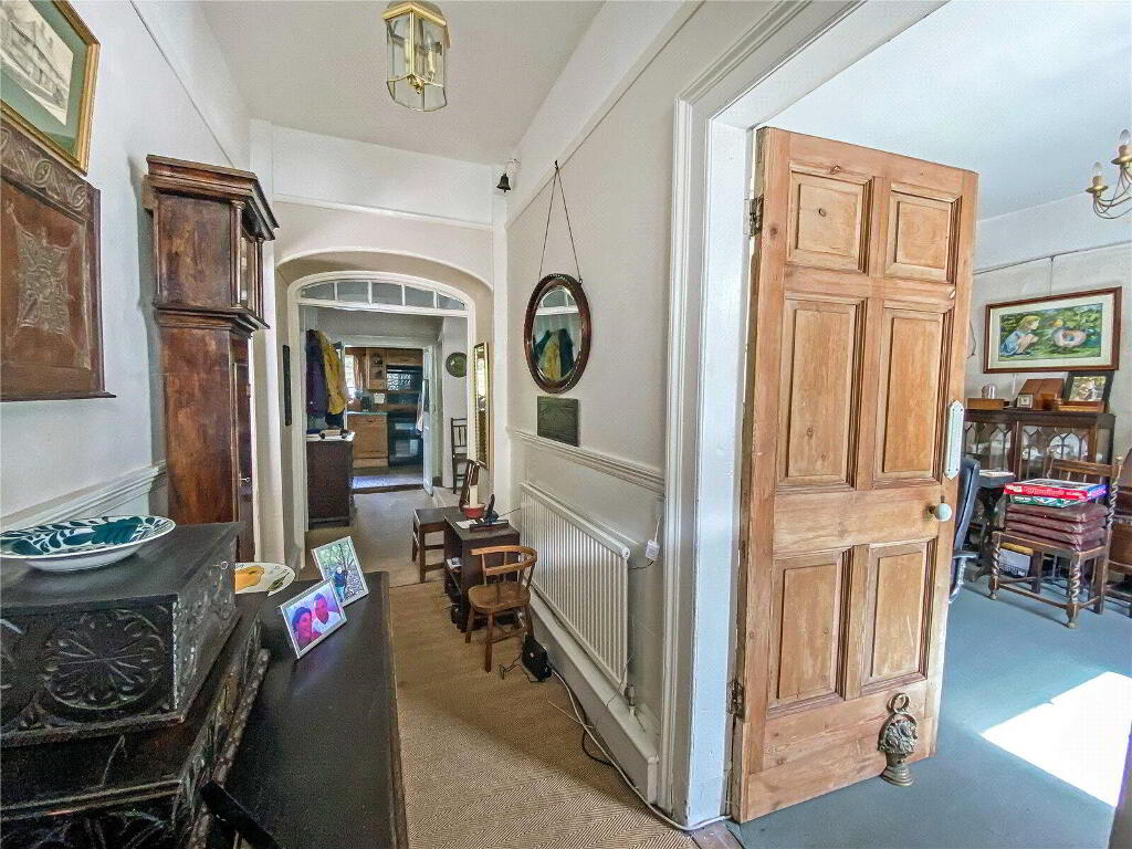 Front aspect via original sash window with removable secondary glazing, impressive high ceilings with original picture rail running into built-in bookshelves either side of the bay, open chimney with wall mounted timber mantel over (currently not working) with deep shelved recesses either side with arched beaded fronts, wall mounted radiator, overhead light point. - Inner Hallway